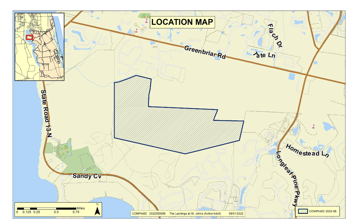 COMPAMD 2022-06 The Landings at St. Johns (Transmittal), request for a Large-Scale Comprehensive Plan Amendment to change the Future Land Use Map designation of approximately 581 acres of land, located south of Greenbriar Road and west of Longleaf Pine Parkway, from Rural/Silviculture (R/S) to Residential-B (Res-B) with a site specific text amendment stating that in locations where the subject property is contiguous to The Landings at Greenbriar site, no Development Edges will be required. This request was heard by the Planning and Zoning Agency at their regularly scheduled public hearing on Thursday, April 6, 2023. The Agency recommended approval of the Transmittal, 4-1.