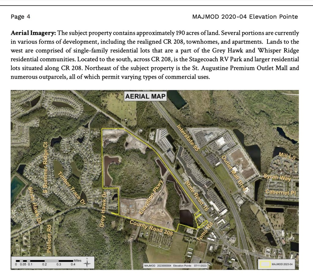 “APPLICATION SUMMARY This is a request to modify the Elevation Pointe at Anderson Park PUD in order to accommodate a planned Publix Supermarket within the commercial portion of the development. The use is proposed at the corner of the future realigned CR 208 and SR 16. The applicant is seeking to reconfigure the commercial outparcels to allow for the use, which will result in additional impacts to adjoining wetlands and open space areas due to an increase in the development area. The applicant also proposes to decrease allowed commercial square footage within the PUD from a maximum 190,000 square feet to 170,000 square feet.”