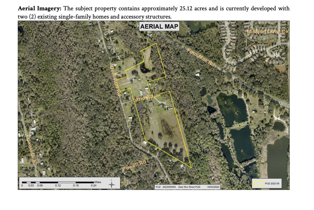 “APPLICATION SUMMARY The Applicant is seeking to rezone approximately 25.12 acres of land from Open Rural (OR) to Planned Unit Development (PUD) to allow for a maximum of 52 dwelling units consisting of 26 residential duplexes. The applicant asserts that the development will provide multi-family housing options for residents that are employed at the area businesses near the SR 16 and I-95 corridor at a price that they can afford. The applicant points out that the proposed duplexes will provide a more affordable and lower maintenance option as compared to single-family homes without the higher density of multi-family townhomes and apartments.” Deer Run Road Presentation