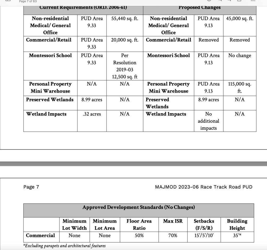 Agenda Item 3 is of interest to residents who live in Race Track Road area in District 1. This is a request to modify the Race Track Road PUD to accommodate construction of a Personal Property Mini-Warehouse Facility (Self Storage.) A Self Storage warehouse is already an allowable usage in this PUD however they are requesting modifications to the currently allowed commercial and office square footage.