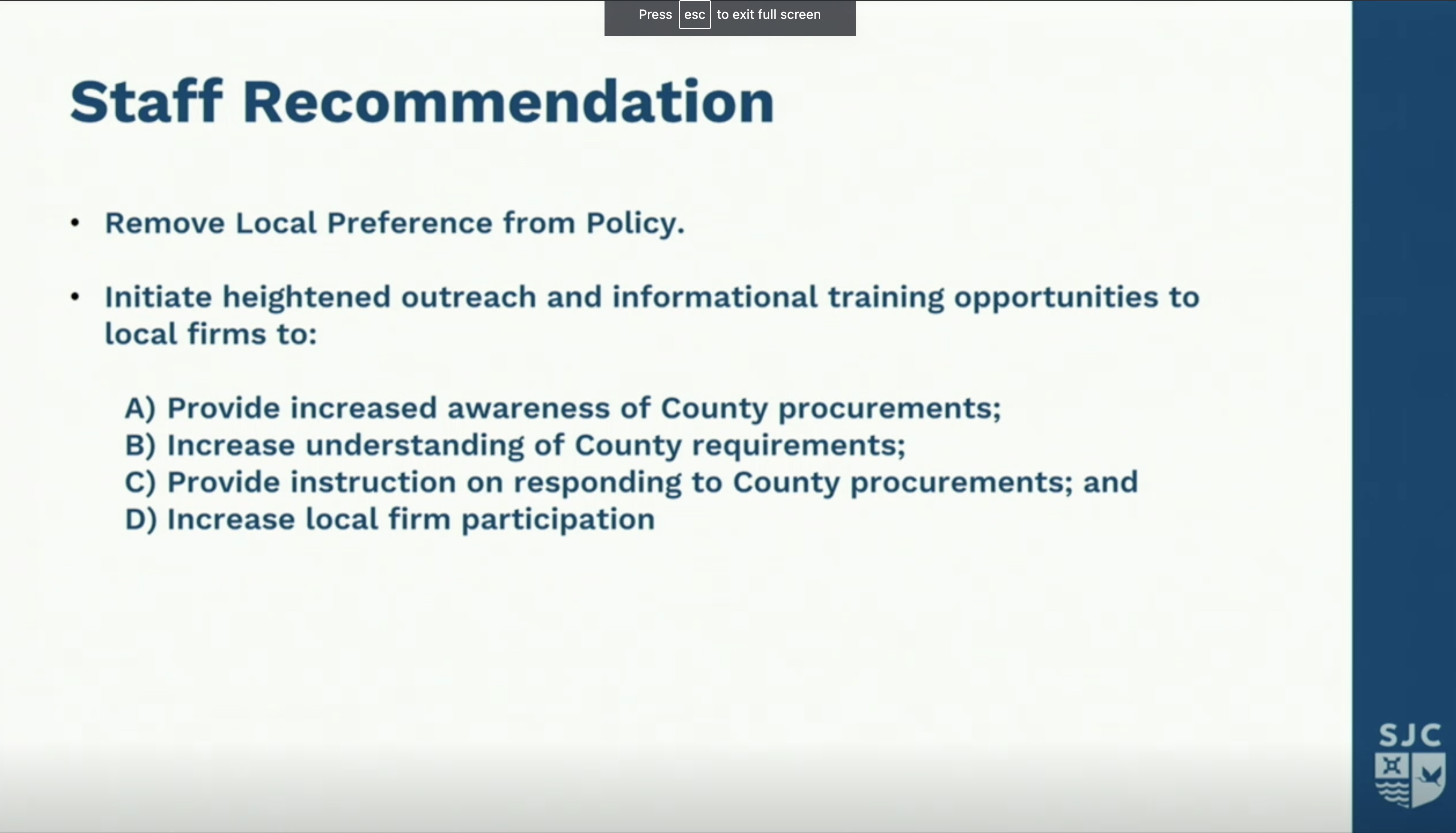 This item was a discussion to determine whether or not to remove the application of Local Preference as included in the SJC Purchasing Policy.