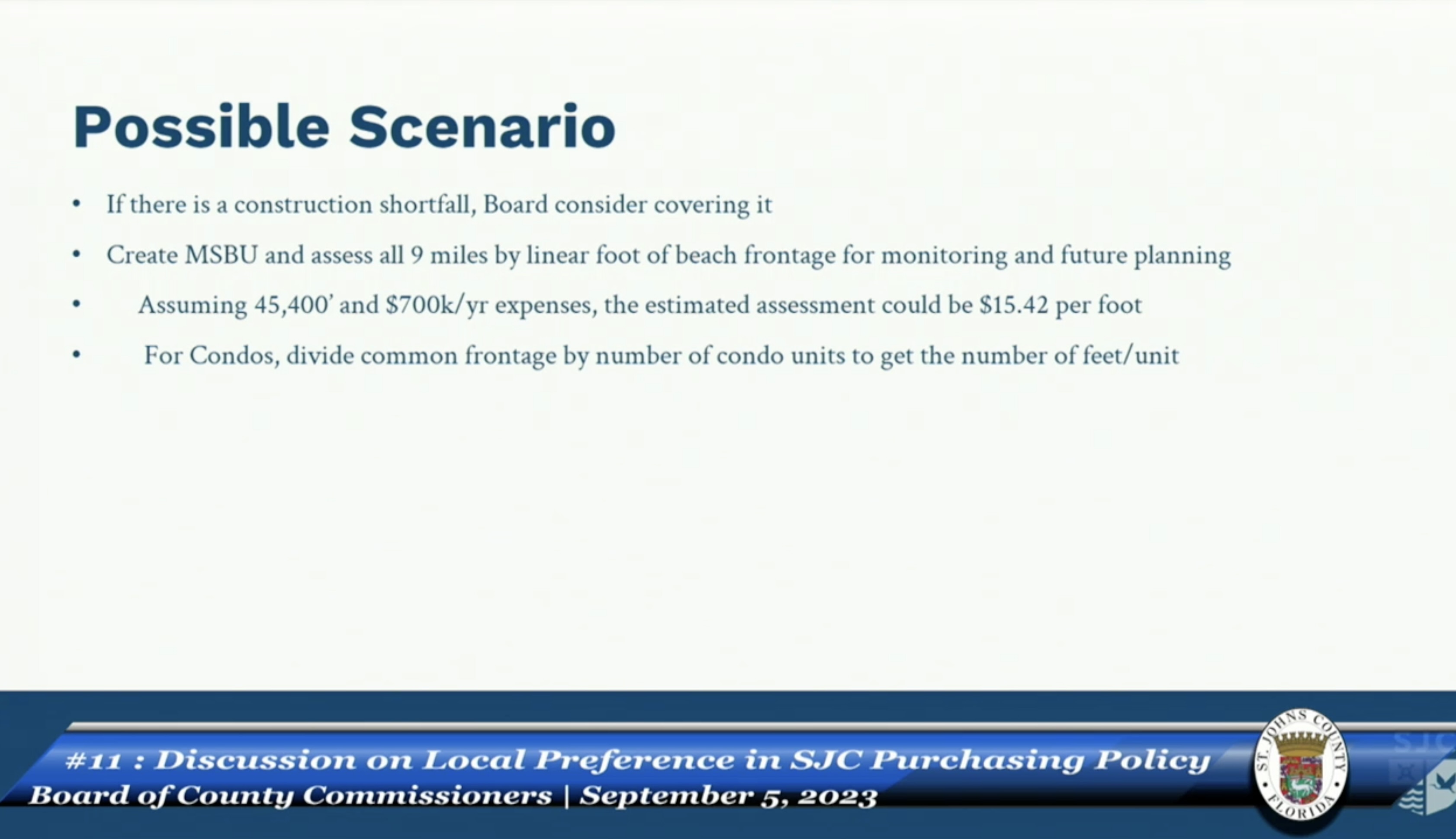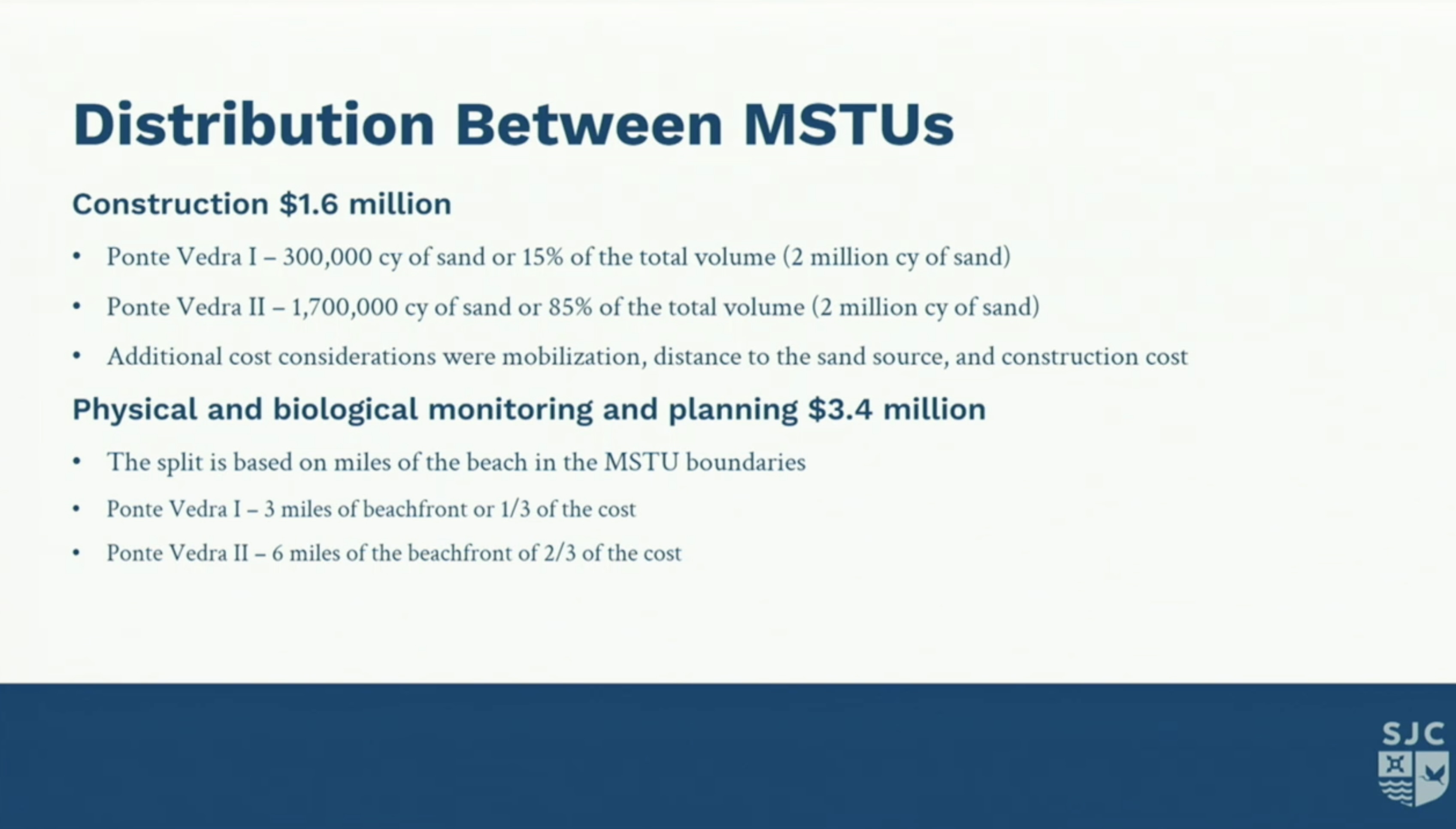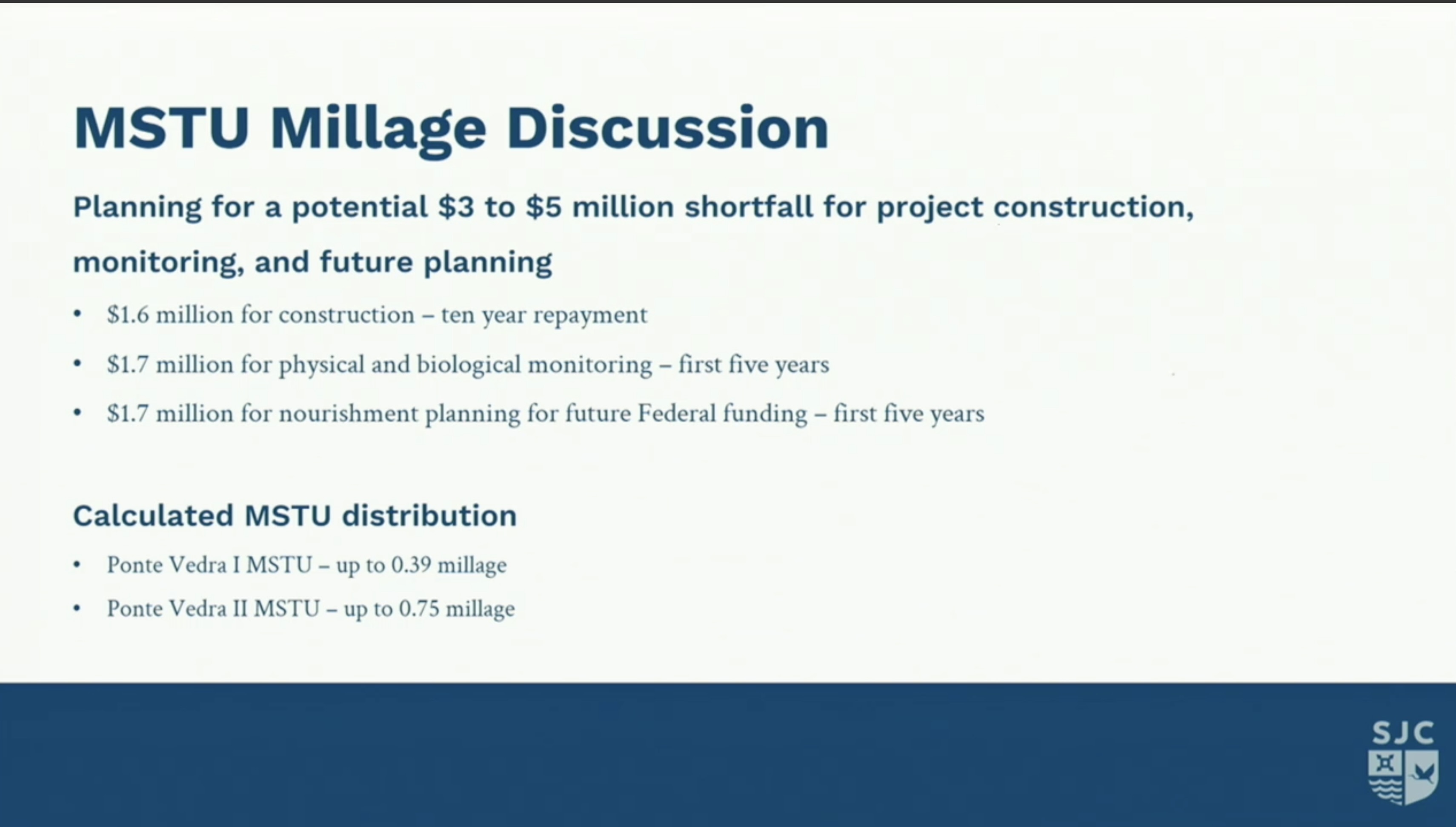 Commissioner Dean spoke about his 5 years of working on this project and disagreed with Commissioner Joseph on how to cover the costs. He indicated that 80% of the cost is related to 6 miles of beach and he supports the staff analysis and breakdown of the millage between the 2 MSTUs.