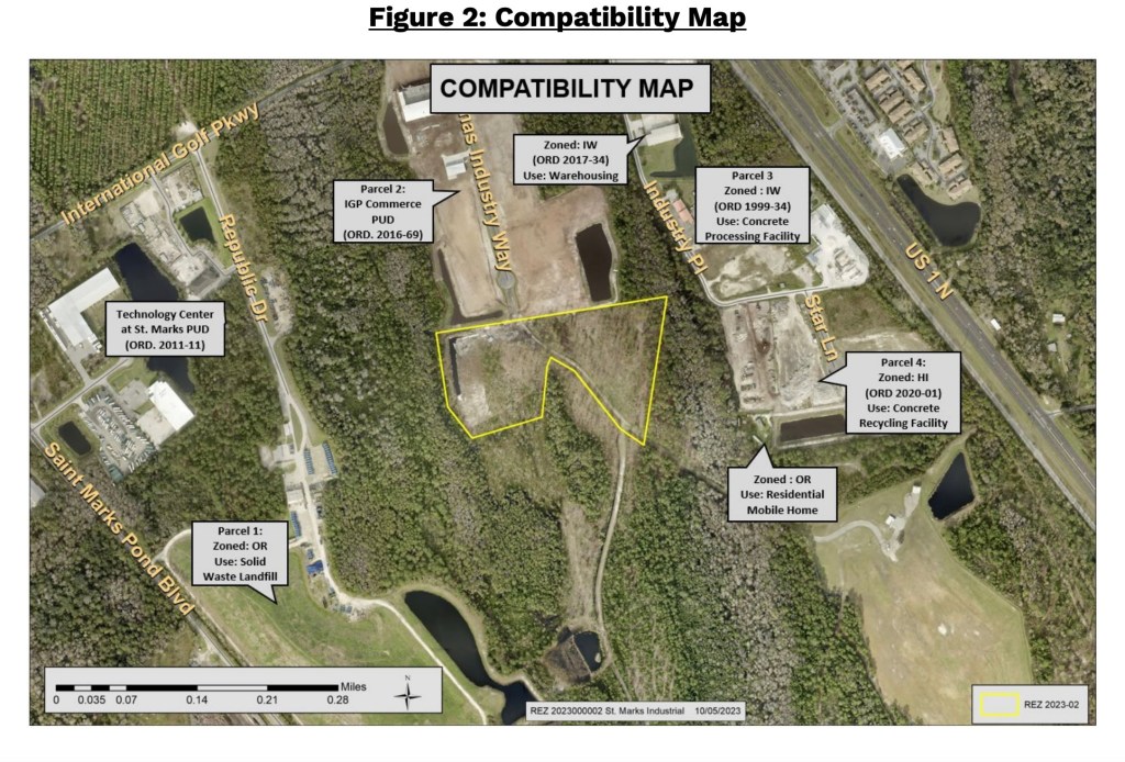 This is a request to rezone approximately 13.26 acres of land, located south of International Golf Parkway, just west of US 1 North, from Open Rural (OR) to Industrial Warehousing (IW). This was recommended for approval by the Planning and Zoning Agency (PZA) at their Thursday, June 1, 2023 meeting. Since that time, the County learned that a portion of the property was the subject of pending private civil litigation. The applicant has revised their application to remove that portion of the property from the request, reducing the proposed acreage for the site from 15.98 acres to 13.26 acres.