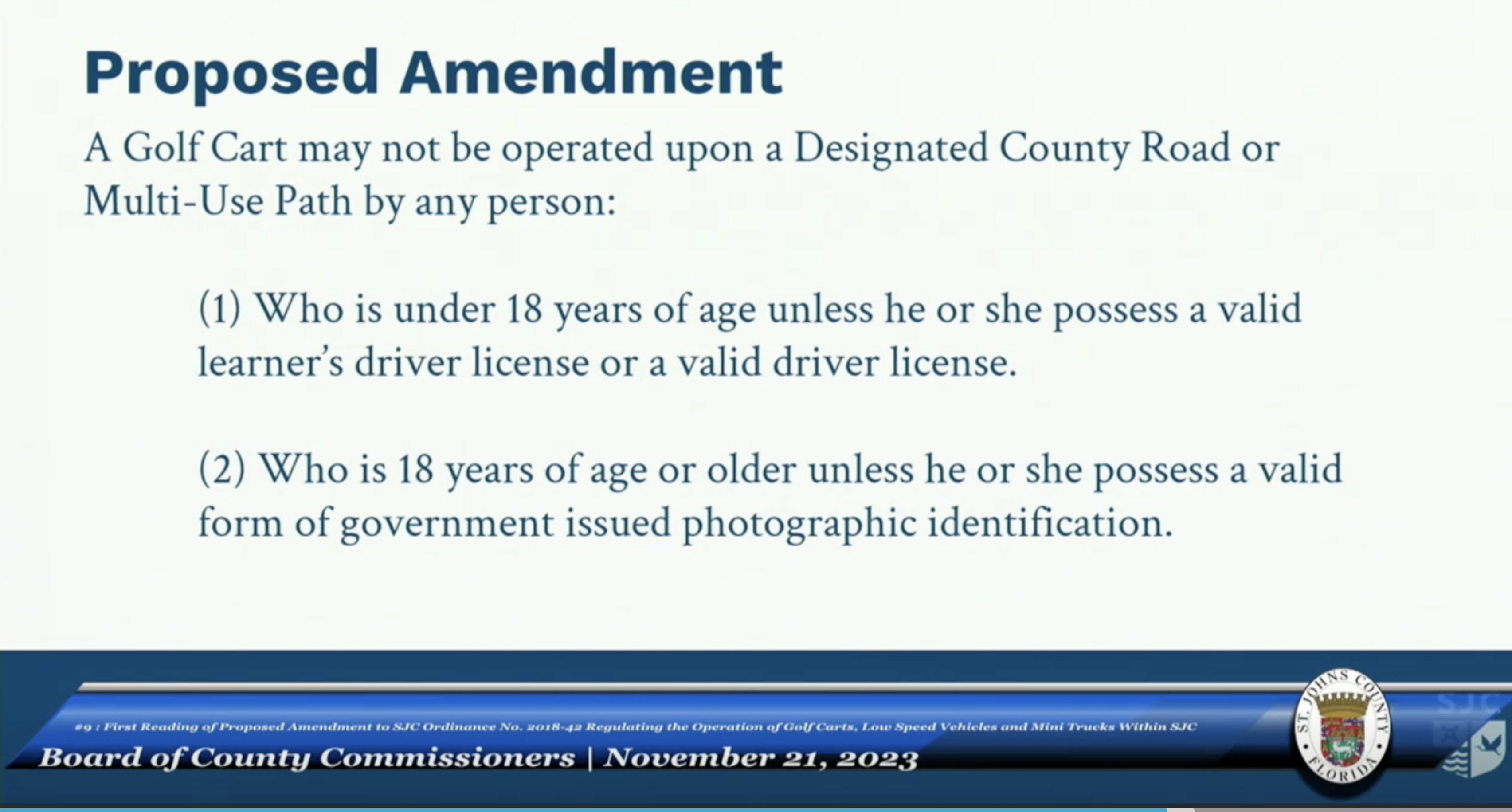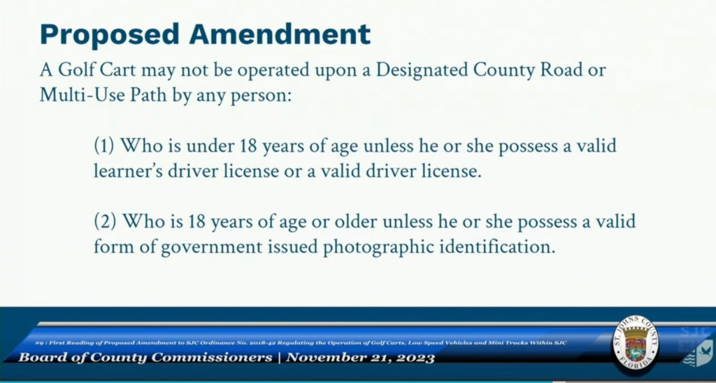 Agenda Item 9 – First Reading of Proposed Amendment to St. Johns County Ordinance regulating the operation of Golf Carts, Low Speed Vehicles, and Minitrucks within St. Johns County