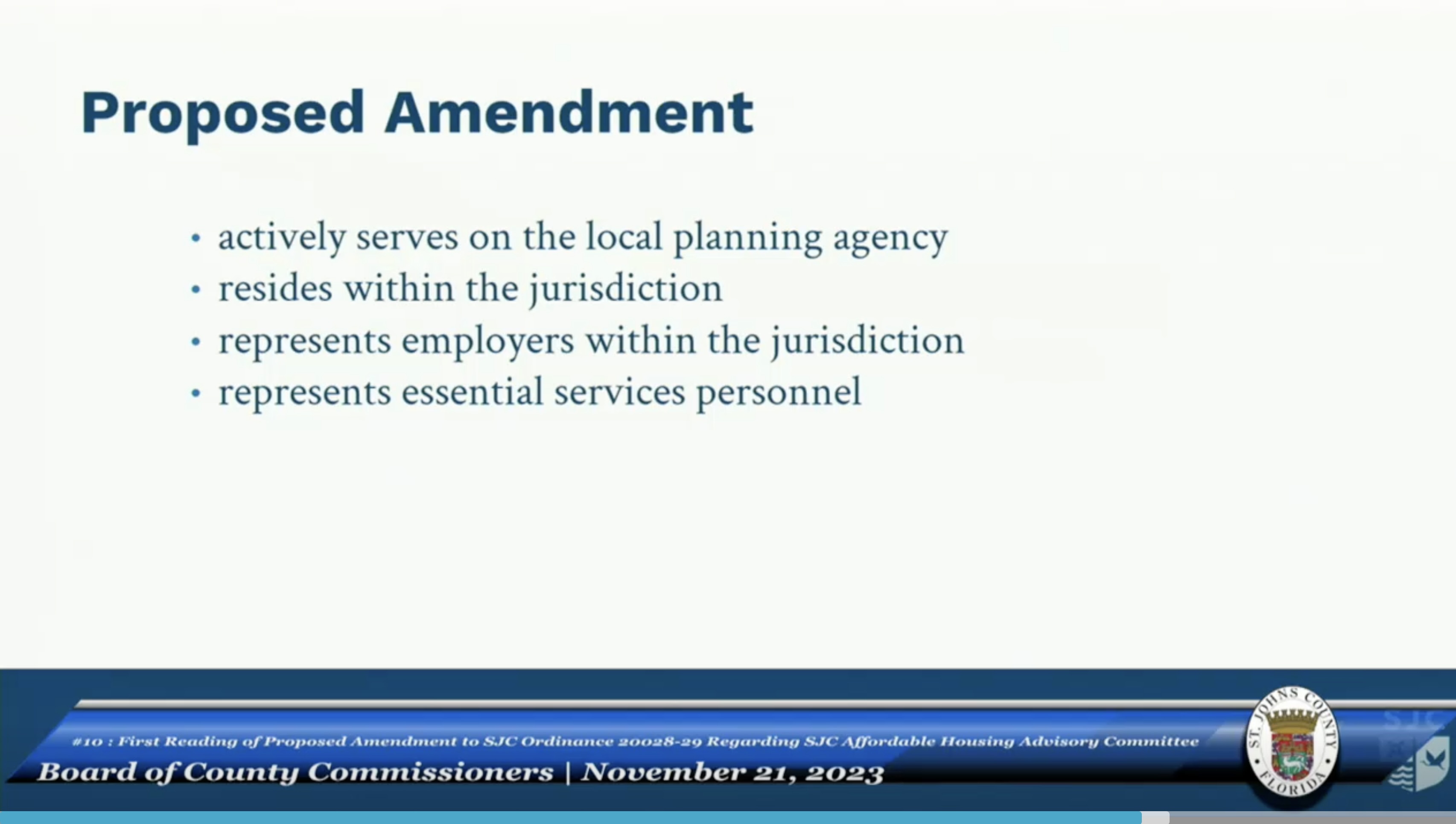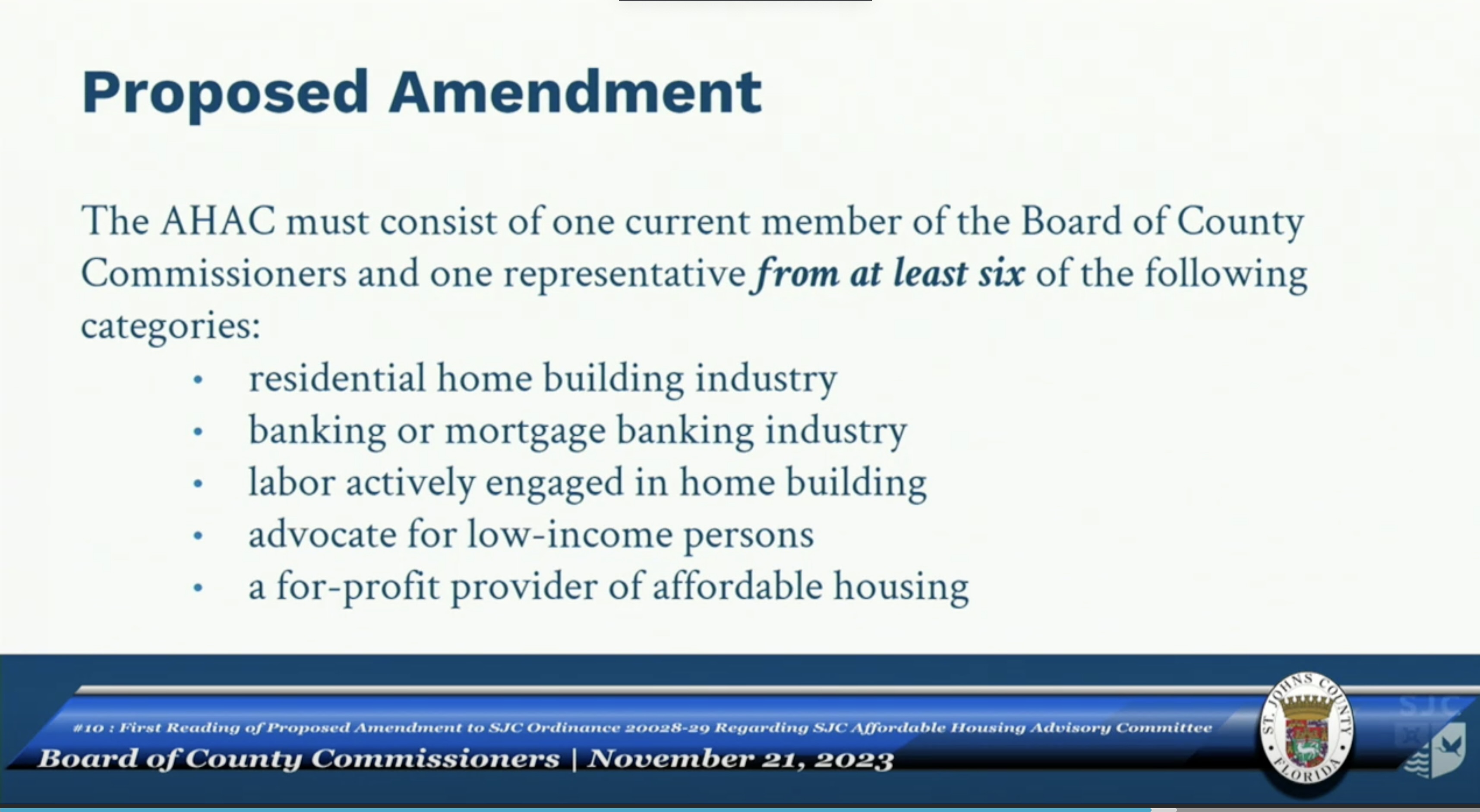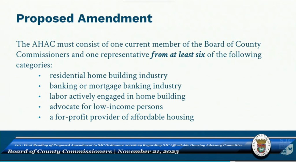 Agenda Item 10 – First Reading of Proposed Amendment to St. Johns County Ordinance regarding St. Johns County Affordable Housing Advisory Committee