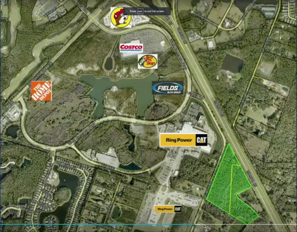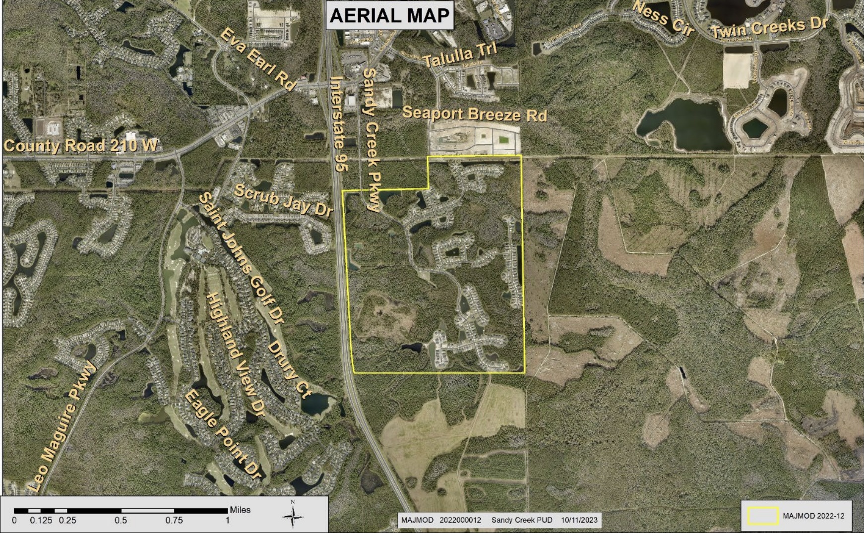 “The applicant is requesting a Major Modification to the Sandy Creek PUD (Ordinance 2003-67, as Amended) to do the following: – Add a secondary access to CR 210 by constructing a road off-site connecting Sandy Creek Parkway to Moon Bay Parkway to provide access to a signalized intersection at CR 210. – Remove all currently allowed Light Industrial entitlements (487,000 square feet) – Subdivide the 128.02 acre Light Industrial parcel into two parcels o 36.18 acres will have 310 multi-family units (115 to be transferred from the current multifamily parcel, and 190 new multi-family units) o 92.81 acres will have up to 74 additional single family homes – Subdivide the 50.78 acre multi-family parcel (currently approved into two parcels) o 30.51 acres of the multi-family parcel will remain multi-family, and the allowed entitlements will be reduced from 465 to 320 o 20.27 acres remaining will become a passive park subject to a conservation easement – Revise the MDP text and Map to reflect these changes and areas of new development”