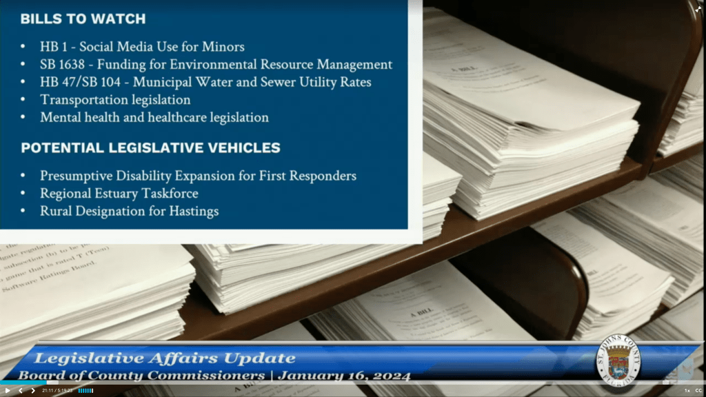 Attorney’s Report – In the matter of Krista Joseph v. St. Johns County Board of County Commissioners and State’s Attorney R. J. Larizza, he will schedule an Executive Session of the Board of County Commissioners. The subject matter will the specifically the litigation and held in full compliance with Florida law. Commissioner Alaimo asked if she would be in attendance at the meeting. Attorney Migut is in conversation with her attorney on that matter.