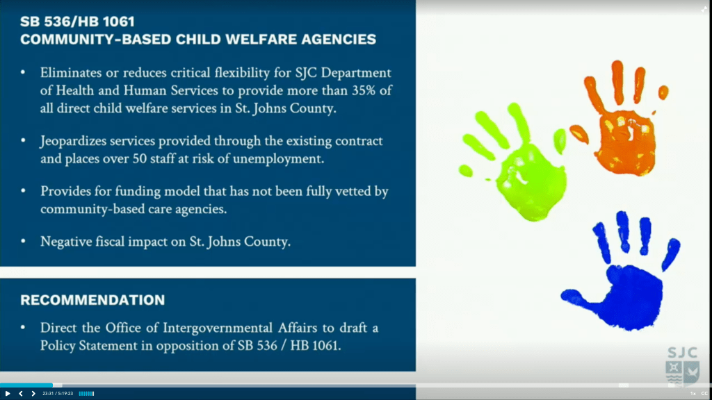 Mr. Teckler recommended the county draft formal opposition to the Community -Based Child Welfare Agencies bill as it would have negative fiscal impact on St. Johns county as well as negative impact on needed child welfare services in the county.