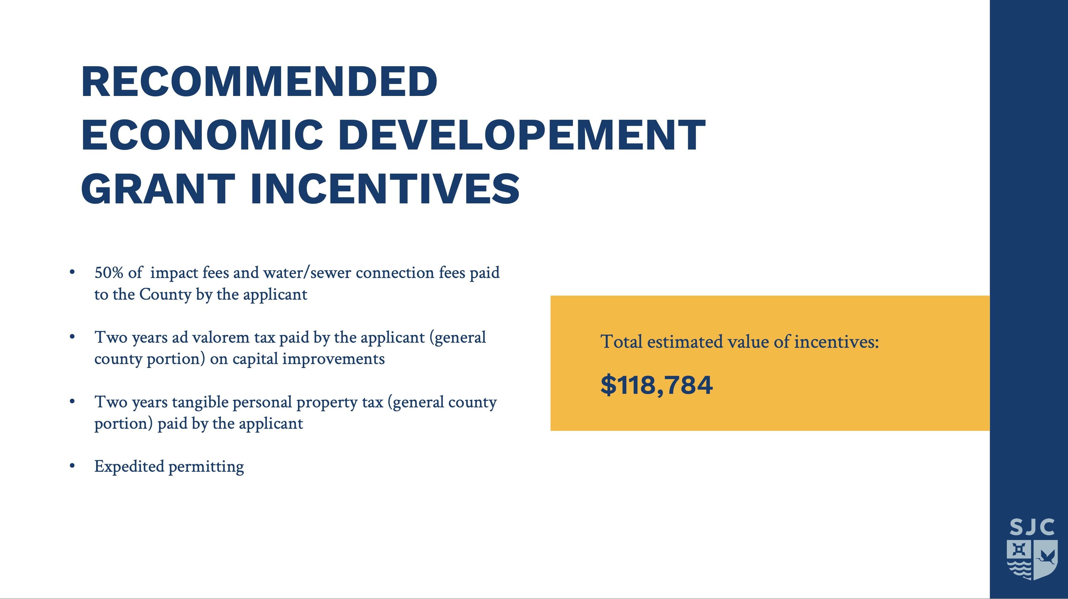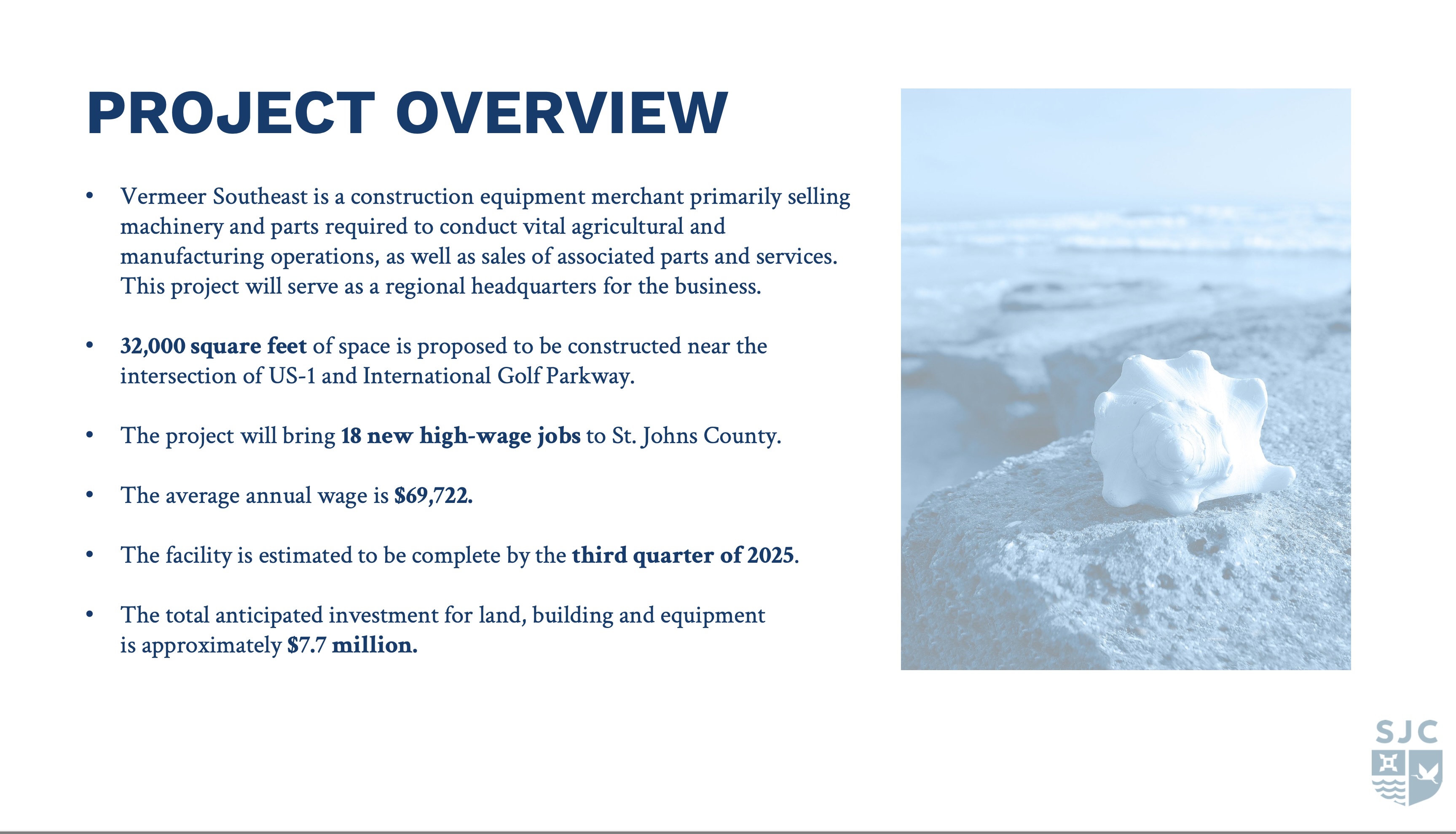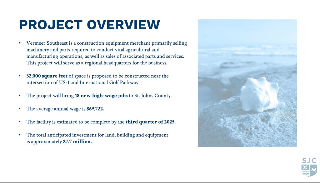 “The St. Johns County Economic Development Agency has received an application from Vermeer Southeast Sales & Service, Inc. for economic development incentives to develop a total of 32,000 square feet of space located near the intersection of US 1 and International Golf Parkway. The Applicant is a construction equipment merchant primarily selling machinery and parts required to conduct vital agricultural and manufacturing operations, as well as sales of associated parts and services. This project will serve as a regional headquarters for the business. After the Applicant submitted their application, they subsequently withdrew their request for confidentiality. The project scored 5.5 points under the new industry category of the County’s Business Incentive Program, which makes it eligible for expedited permitting and an economic development grant of up to 50% of fees paid to the County by the Applicant (impact fees and water/sewer connection fees), two years ad valorem taxes paid by the Applicant (general County portion) on capital improvements and two years tangible personal property taxes paid by the Applicant (general County portion). Completion of the project is anticipated by the third quarter of 2025. With this schedule, the first annual grant payment would be anticipated during FY27. The total estimated value of the incentive is $118,784. In accordance with Program requirements, the Agency is required to review the application and make a written report to the Board of County Commissioners. Staff recommends support of this incentive application.”