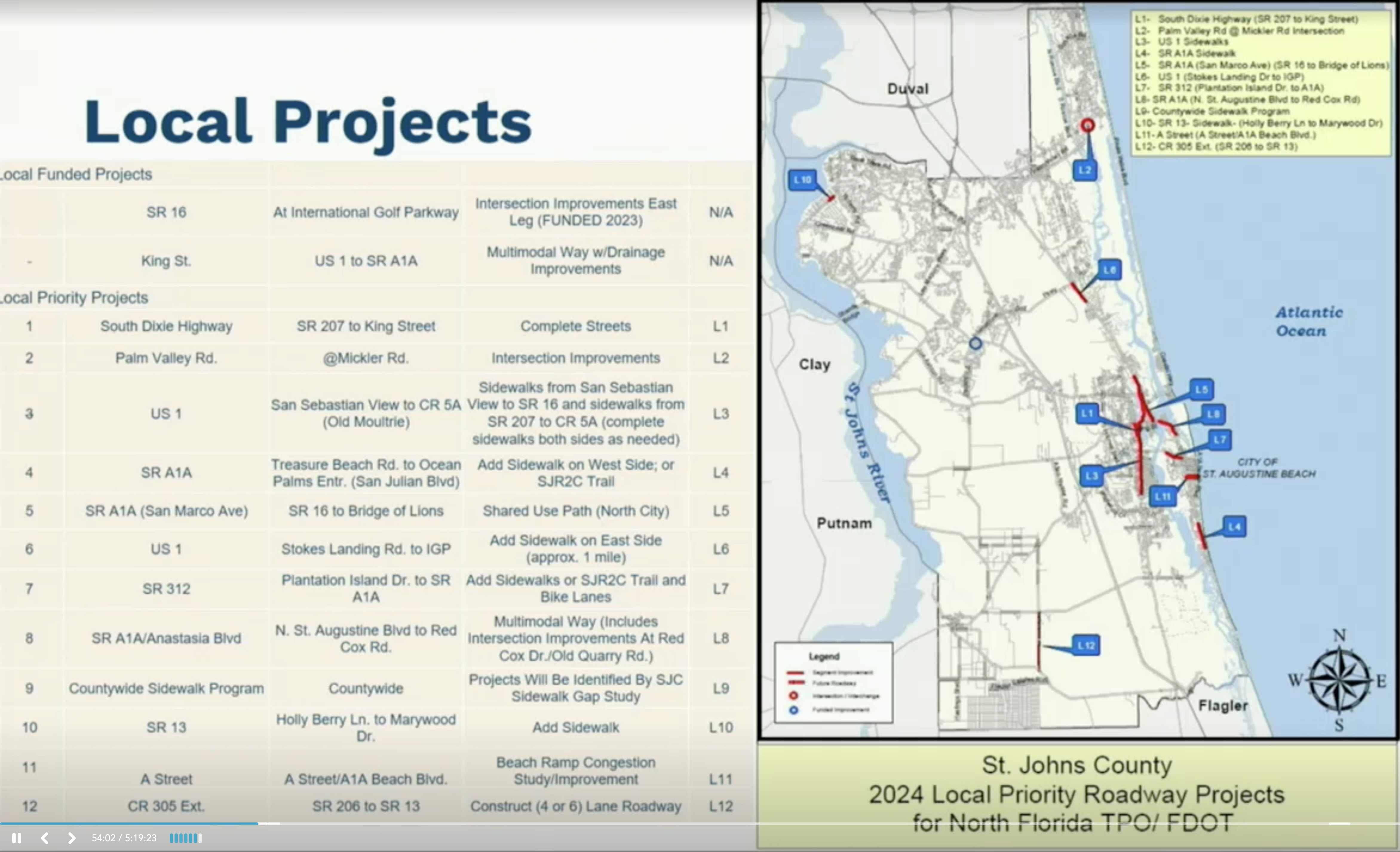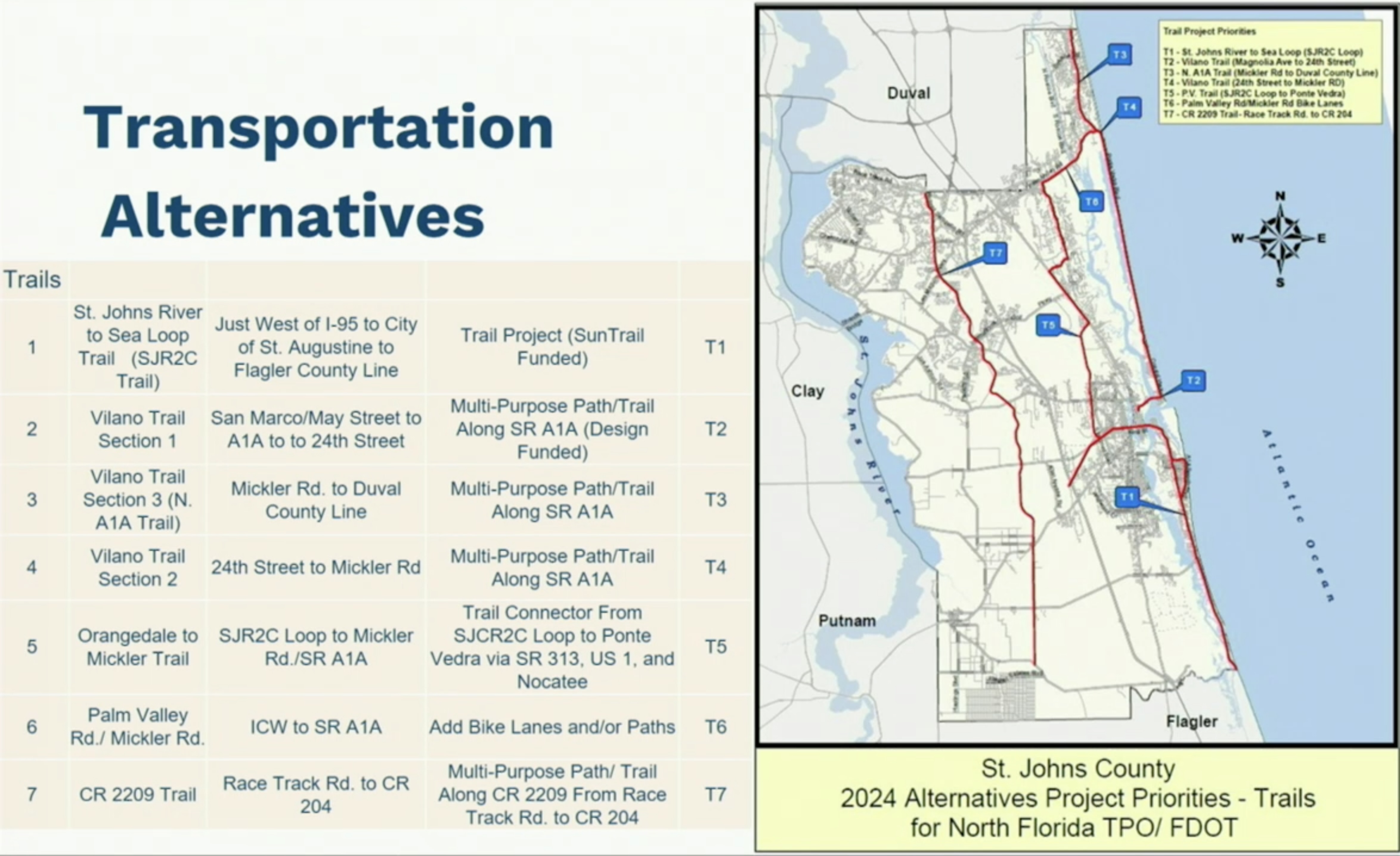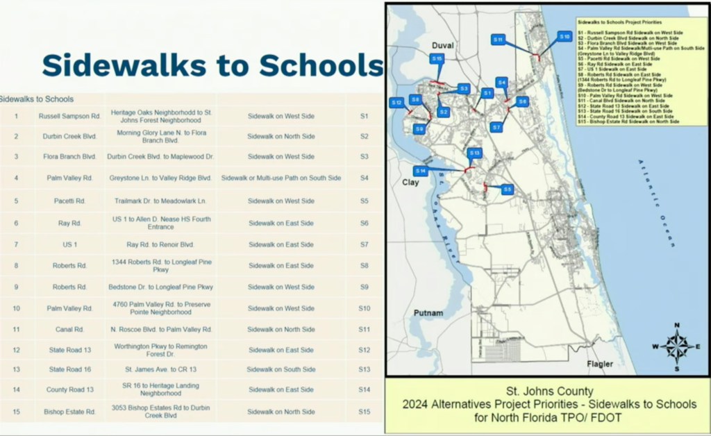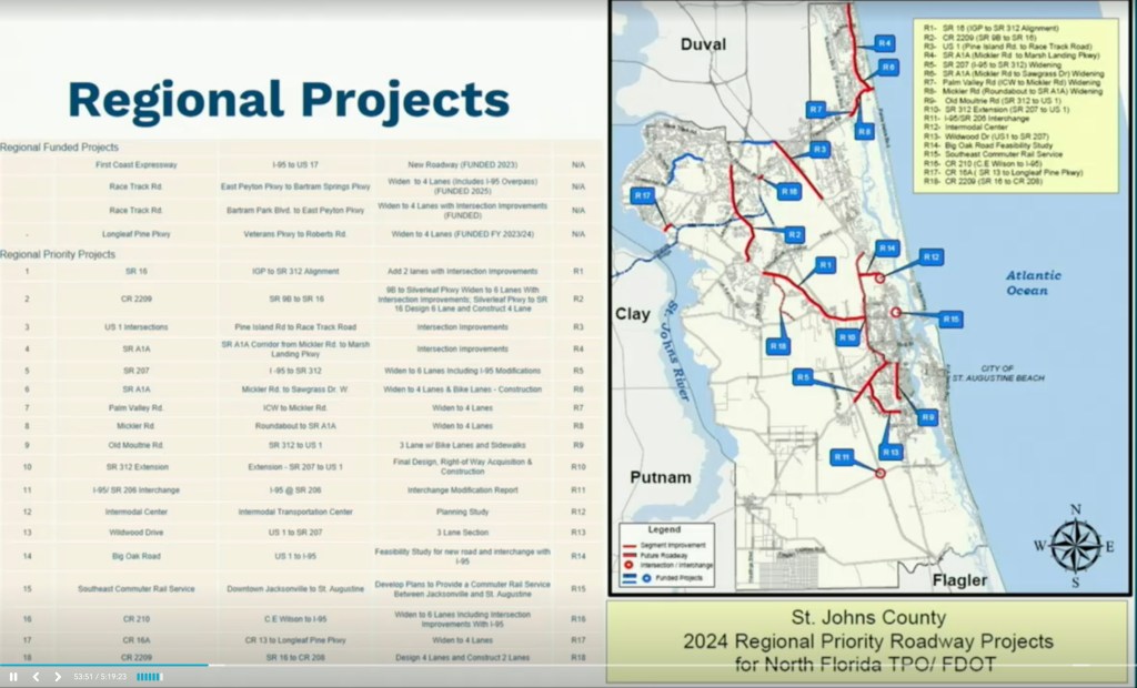 Annually the Florida Department of Transportation (FDOT) and the North Florida Transportation Planning Organization (TPO) request project priorites from local governments for potential funding in FDOT’s Work Program. There is a Transportation Advisory Group in St. Johns County made up of representatives from local municipalities and concerned citizen’s groups. Assistant Director of Growth Management, Dick D’Souza presented the priority list for approval by the commissioners.