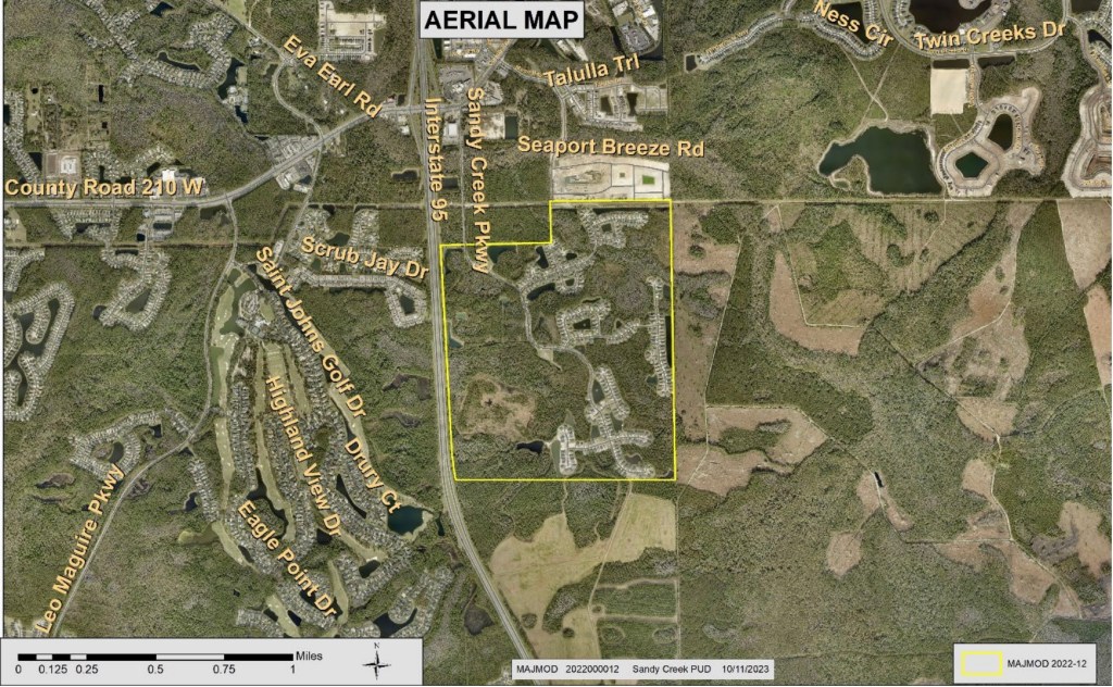 “Request for a Major Modification to the Sandy Creek PUD (ORD. 2003-67, as amended) to add a secondary access to CR 210; to remove all the currently allowed industrial entitlements; to add additional multi-family and single family units; and to revise the Master Development Plan (MDP) text and map. The Sandy Creek PUD is located on the south side of CR 210 at Sandy Creek Parkway and CR 210.”