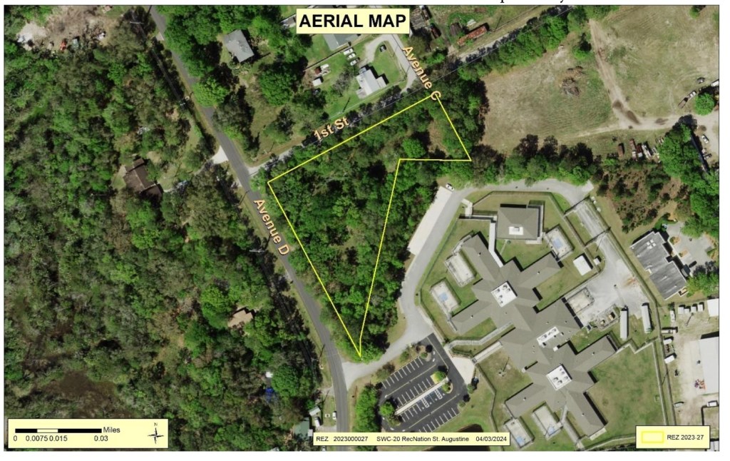 Agenda Item 6 is a request to rezone 1.52 acres of land from Residential, Single Family to Industrial Warehousing for the purpose of building a 189,320 Sq. Ft RV & Boat Storage Facility. This parcel is located at the intersection of Avenue D and 1st Street, west of US 1.