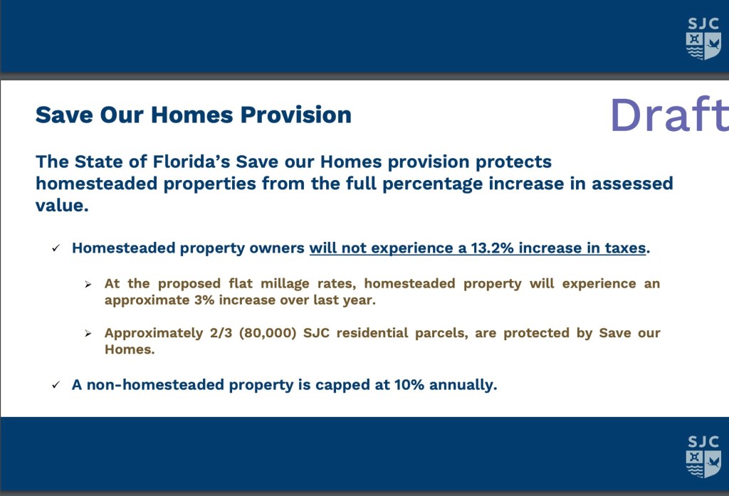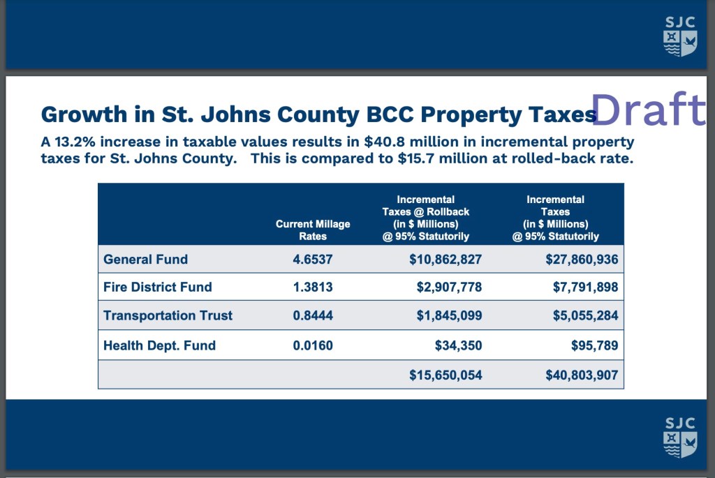 “The BCC will need to approve proposed Millage rates (see the attached sheet) for the County’s TRIM mailing, and approve September 3, 2024 @ 5:01 PM in the County Auditorium as the Date, Time and Place of the first public hearing for the adoption of the FY 2025 Budget for the St. Johns County Board of County Commissioners”