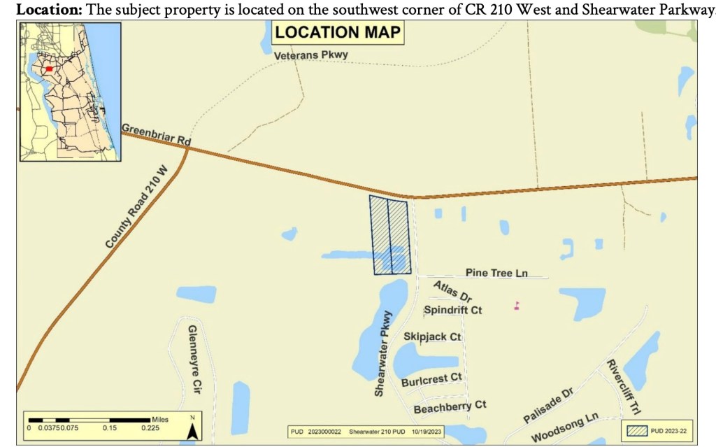 “Request to rezone approximately 6.04 acres of land from Open Rural (OR) to Planned Unit Development (PUD) to allow for a maximum of 72,480 square feet of commercial, retail, and/or office uses; located on the southwest corner of CR 210 W and Shearwater Parkway. This request is a companion application to CPA (SS) 2023-11. This request was originally heard at the 4/18/2024 PZA, where it was continued with a 4-2 vote. At the 6/20/2024 PZA, it was recommended for denial with a vote of 6-0. Agency members and nearby residents discussed a range of topics, including compatibility, traffic on CR 210 W and the status of it being widened, the approved CR 210 Town Center PUD located to the north, and the demand for non-residential uses in general for the nearby area.”