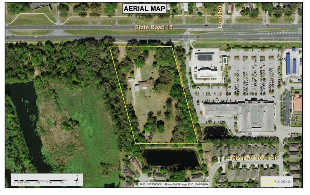 “Request to rezone approximately 5.99 acres of land from Open Rural (OR) to Planned Unit Development (PUD) to allow for a maximum 100,000 square foot Self Storage facility, specifically located at 1065 State Road 16. The Planning and Zoning Agency (PZA) heard this request at their regularly scheduled public hearing on June 20, 2024 and recommended approval with a vote of 6 to 0. Agency members discussed the Applicant’s plan to provide buffers along SR 16 and Mission Trace, where the Applicant highlighted that the buffer reduction was limited to the southwest corner of the site. They also noted that the reduced setback was adjacent to the open space parcels for Mission Trace to the south and west. The Agency discussed the Applicant’s plan for the preservation of significant trees, controlled onsite lighting, security fencing, and acknowledged the Project Team’s outreach through unofficial meetings with Mission Trace neighbors. There was only one member of the public who spoke during public comment, and they presented the Applicant’s agreement to address site/area security, adequate stormwater management, prevention of damage/trespass during construction, and appreciation for the courtesy meetings hosted by the applicant.”
