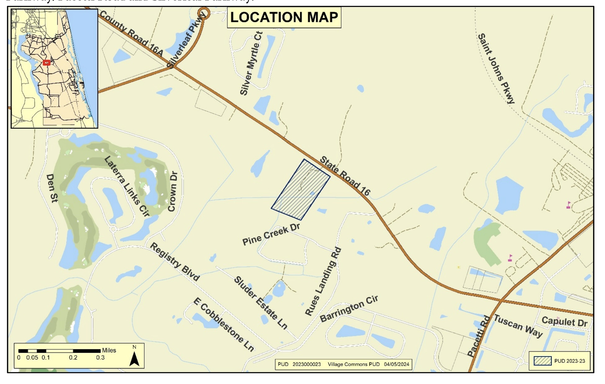 “Request to rezone three (3) parcels from Open Rural (OR) and PUD (Ord 2008-20) to PUD to accommodate a maximum of 55,000 square feet of commercial/retail uses as permitted in the Neighborhood Commercial zoning designation of the Land Development Code, and a 7,000 square foot expansion of the existing church, specifically located at 5845, 5865, and 5885 State Road 16, Saint Augustine. The Planning and Zoning Agency held a Public Hearing on this item on June 6, 2024, and voted 5-1 in favor of recommending approval. Concerns raised by Agency members included increased traffic, and that the church expansion and proposed commercial uses appeared to be incongruent. The applicant waived any right to develop the property pursuant to the Live Local Act, Chapter 2023-17, Laws of Florida, and any subsequent amendments.”