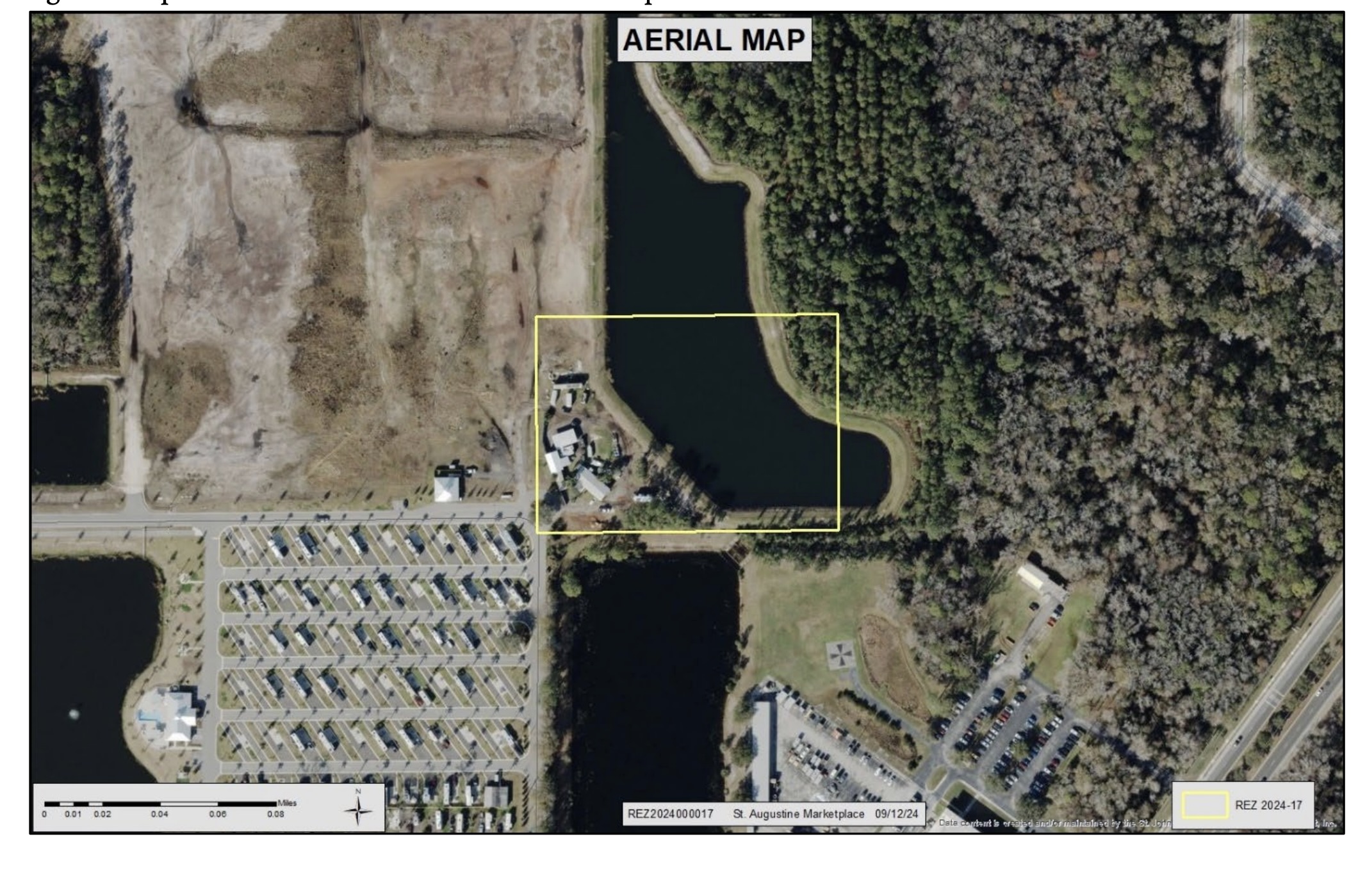 Agenda Items 2 & 3 are for the St. Augustine Marketplace. There is a Small Scale Comp Plan Amendment and a Rezoning request. The requested change is from Res-B to Mixed Use. This is for 5 acres of land located southwest of the I-95 and SR 207 intersection.