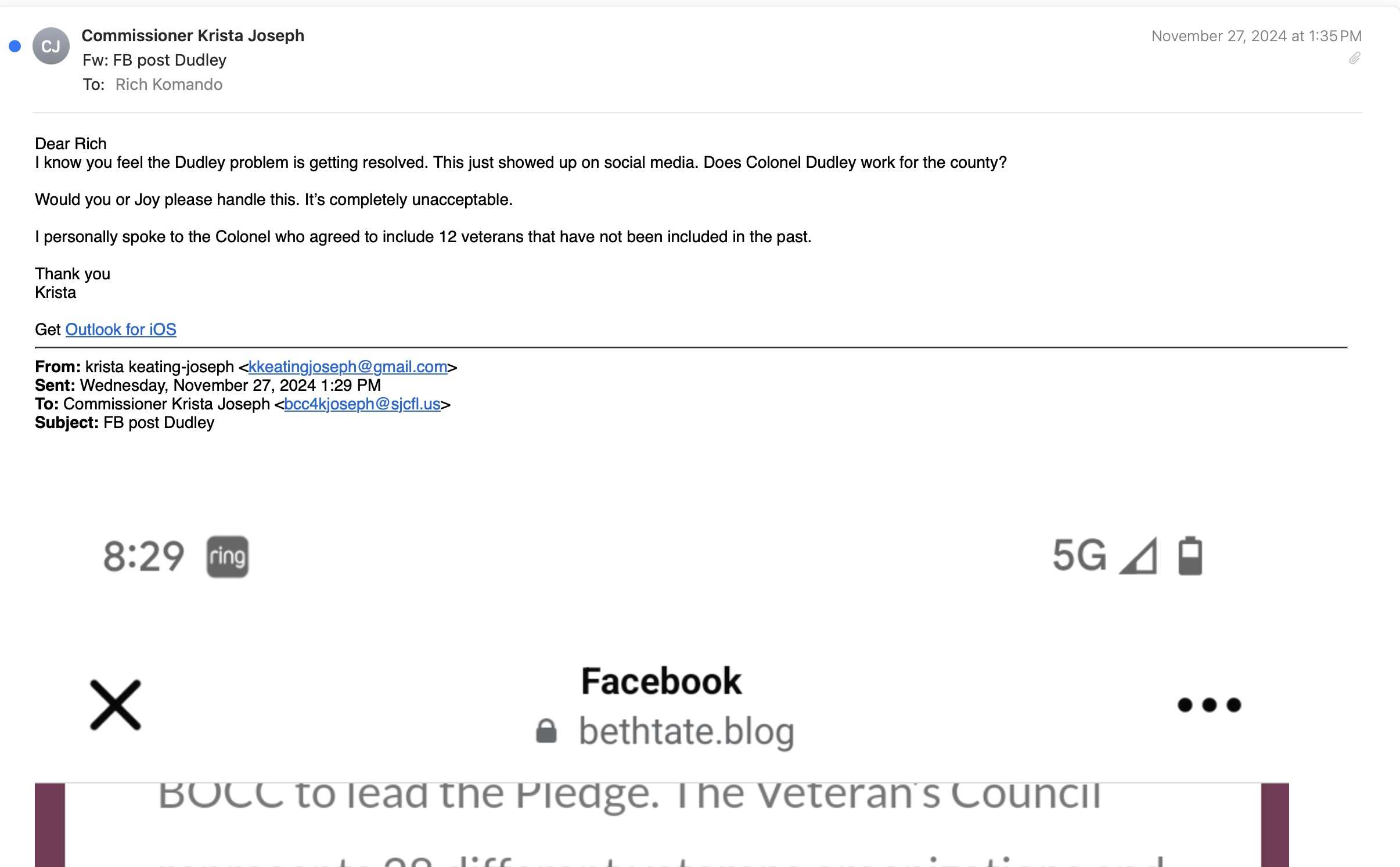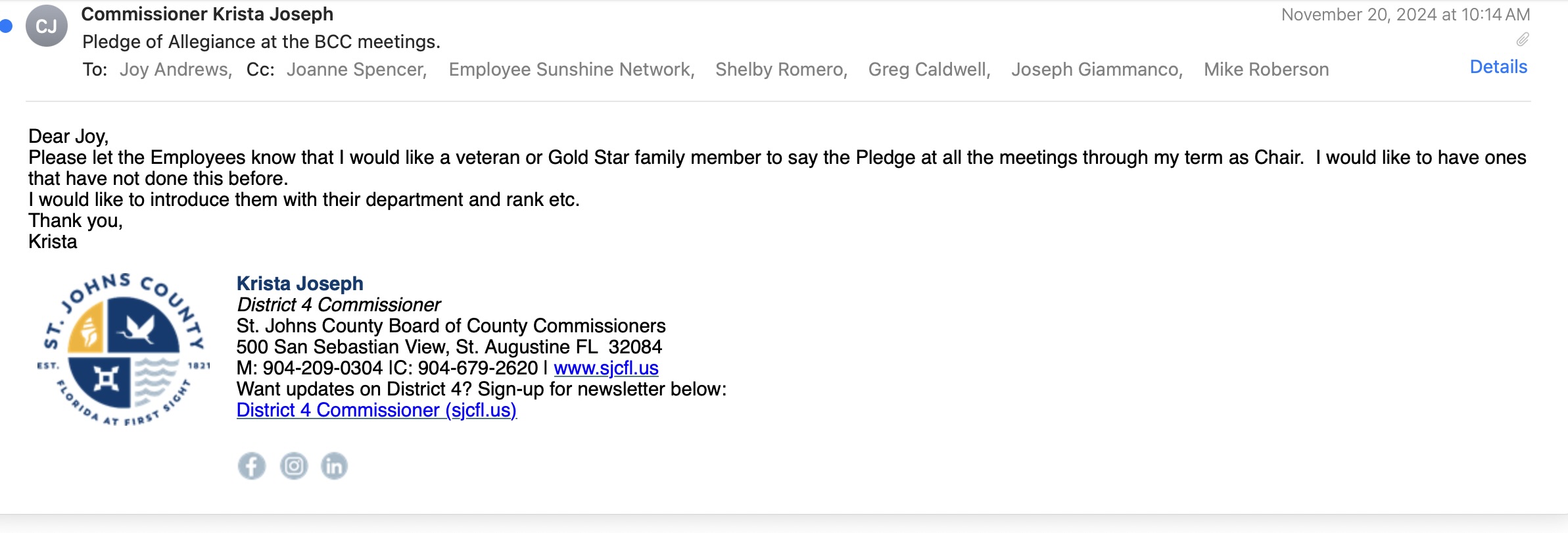 There had been a lot of information floating around the county about the decision to change who led the Pledge of Allegiance. A Public Records Request to the County yielded this email that Commissioner Joseph referenced in her remarks.