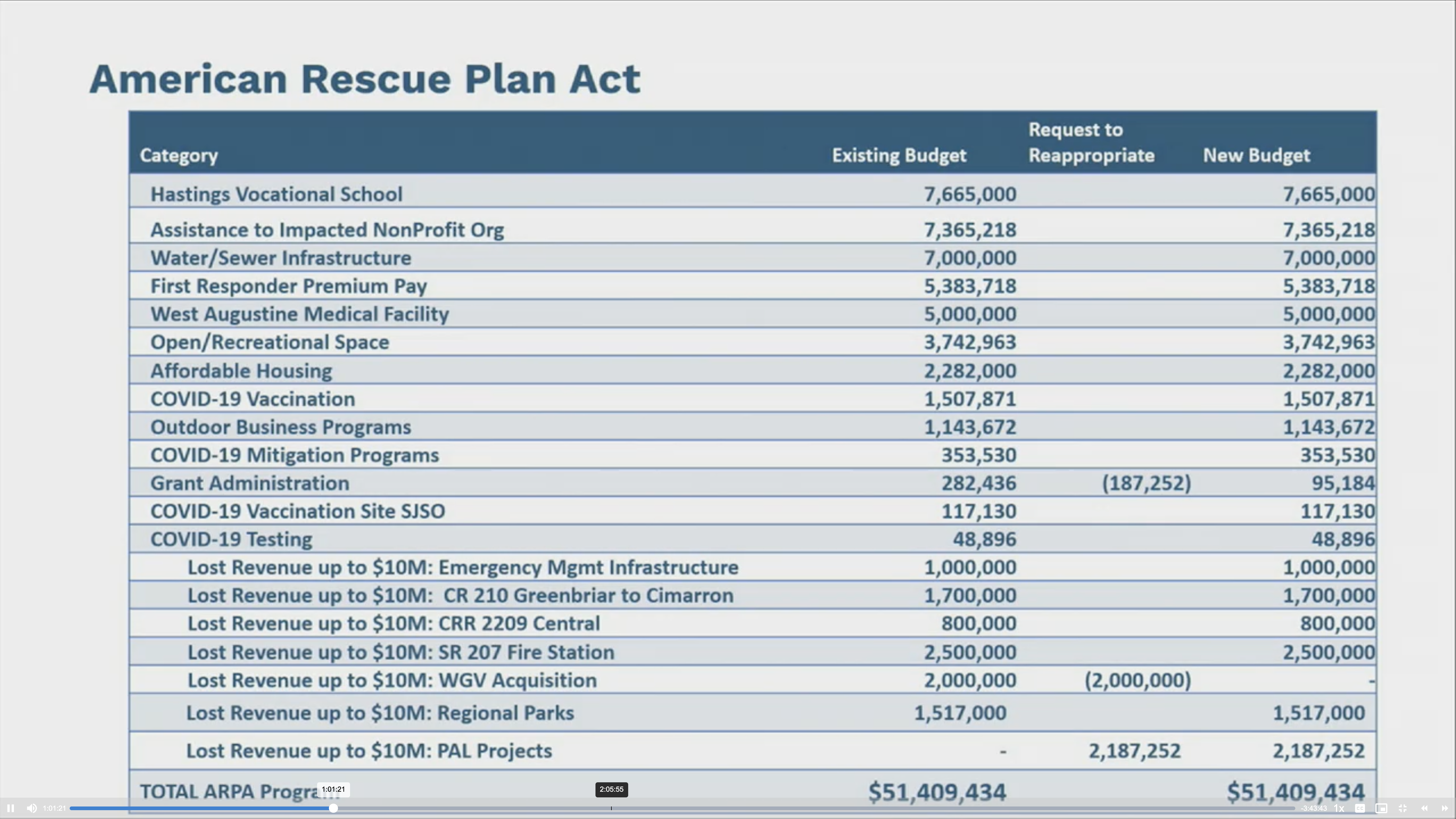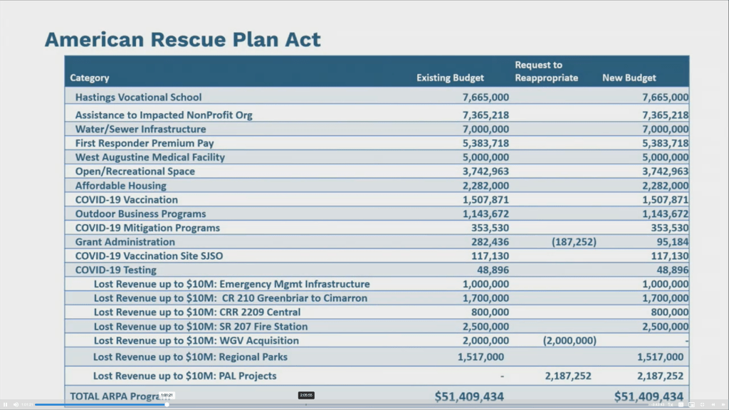 This item is the American Rescue Plan Act (ARPA) Appropriation. Presented by Jesse Dunn, our new Deputy County Administrator. In 2021 the US Department of Treasury launched the Coronavirus State and Local Fiscal Recovery Funds under the ARPA Act of 2021. St. Johns County was allocated $51,409,434. These funds must be expensed by December 31, 2026. This amendment is being recommended in order to maximize the use of funding within St. Johns County by committing the dollars by December 31, 2024. The recommendation is to reallocate $2,187,252 to go into the Police Athletice League Project, the Diamond of Dreams in southwest St. Johns County. This would be an all-inclusive specially designed baseball/multipurpose field and playground for children of all abilities.