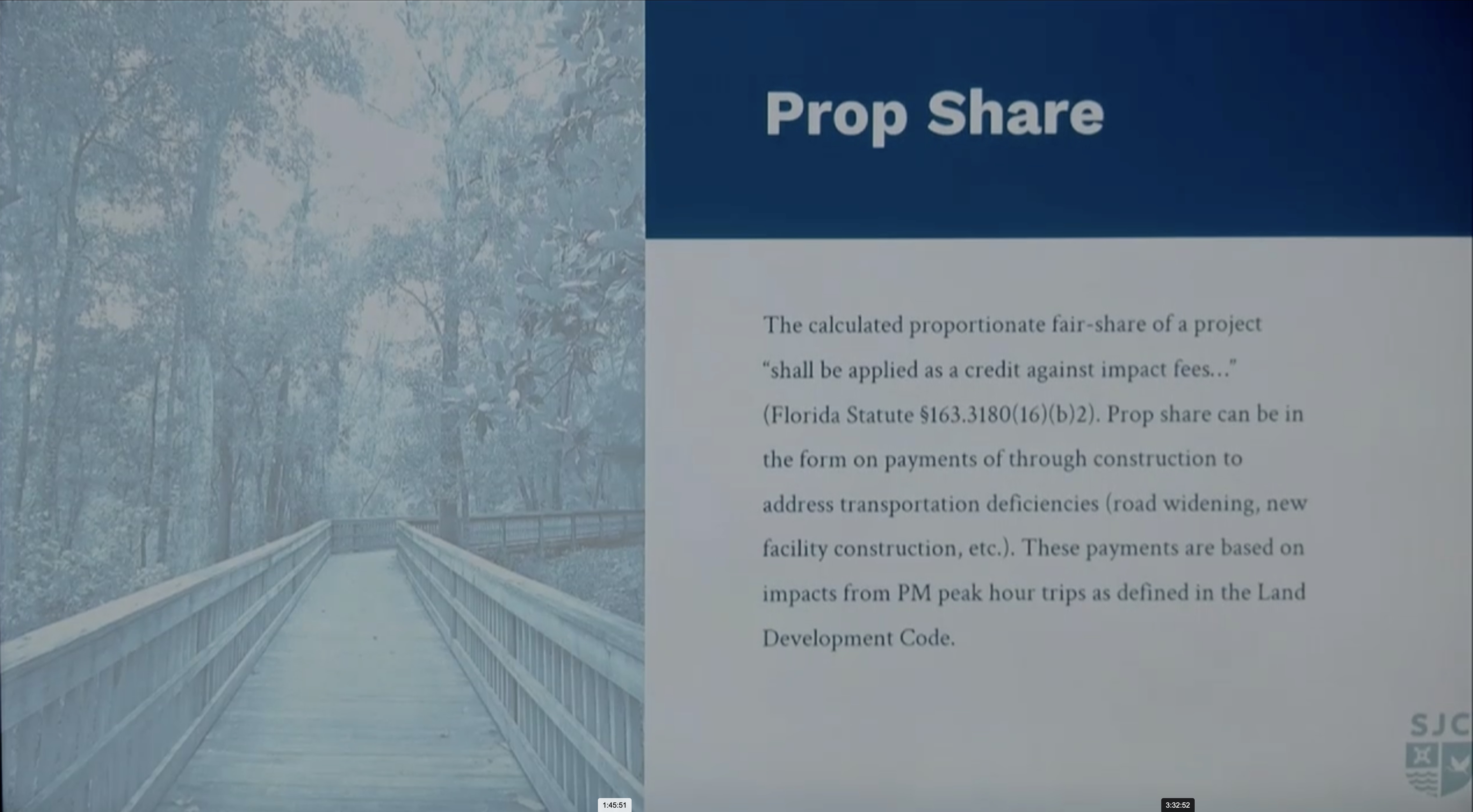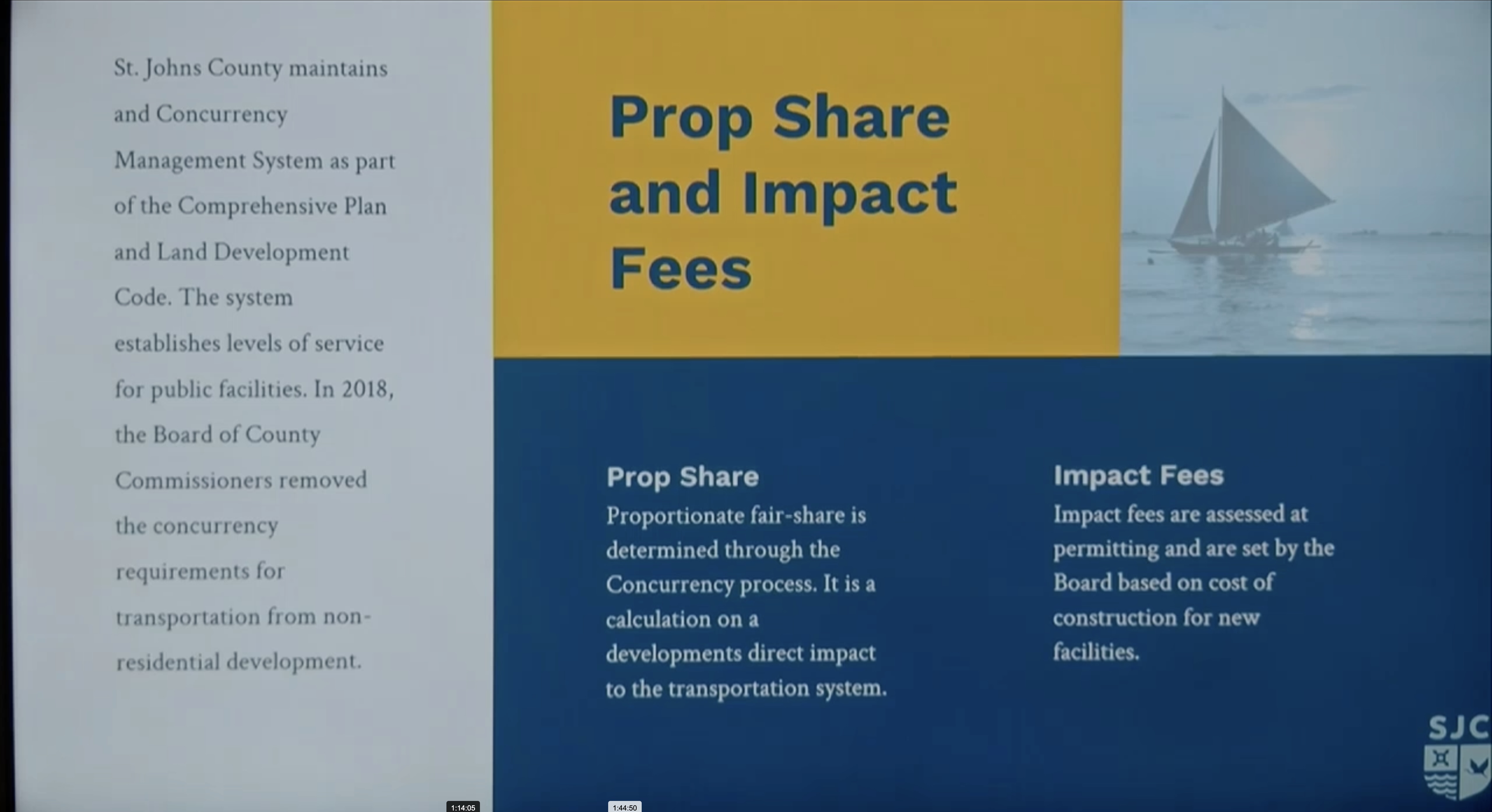 He also asked for and received clarification that concurrency fees are paid up front by the developer and then that amount is used as a credit to buy down their impact fees that are paid at the time of construction. What that means is this is essentially a passthrough for big businesses but may be a barrier for a smaller business just trying to open up.