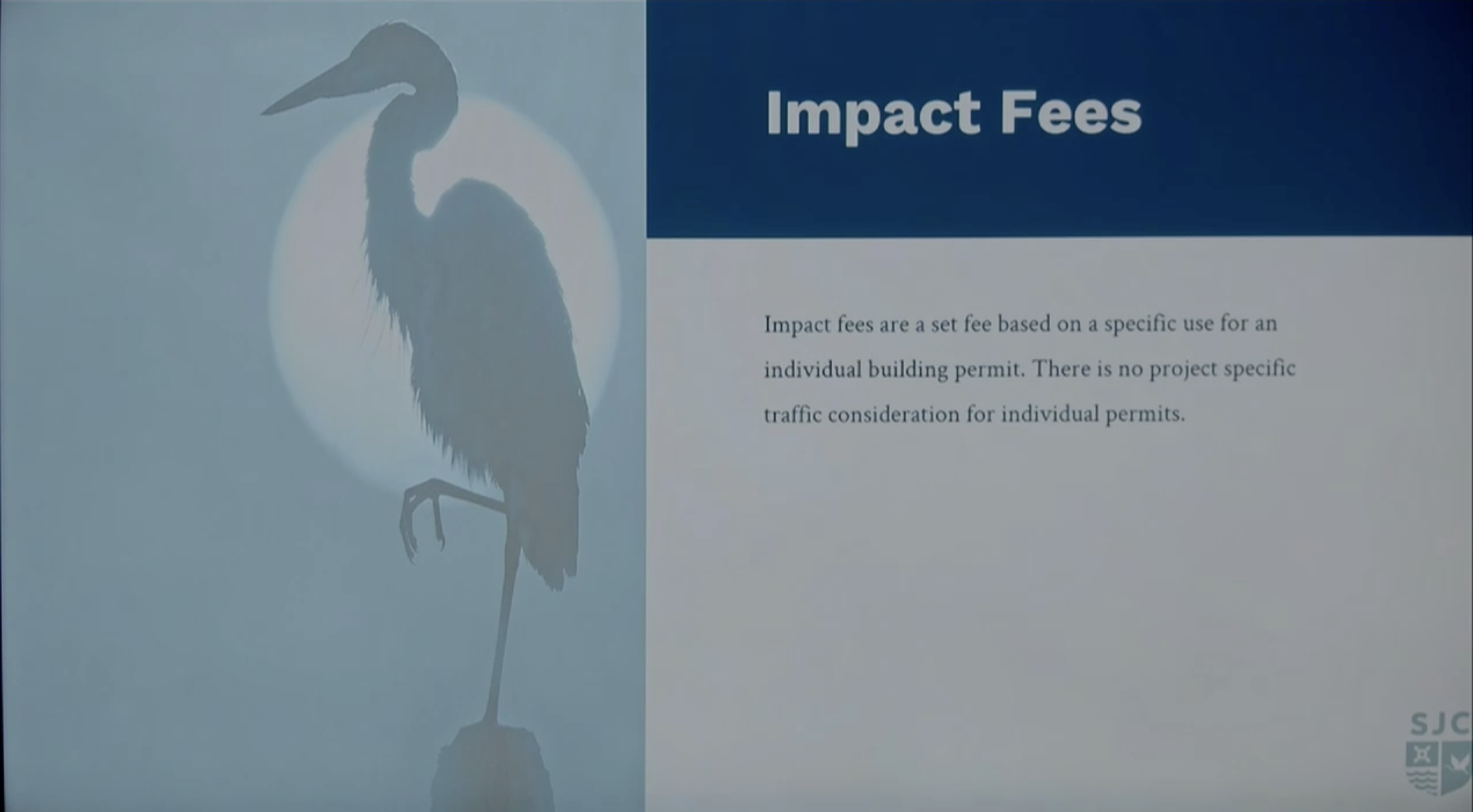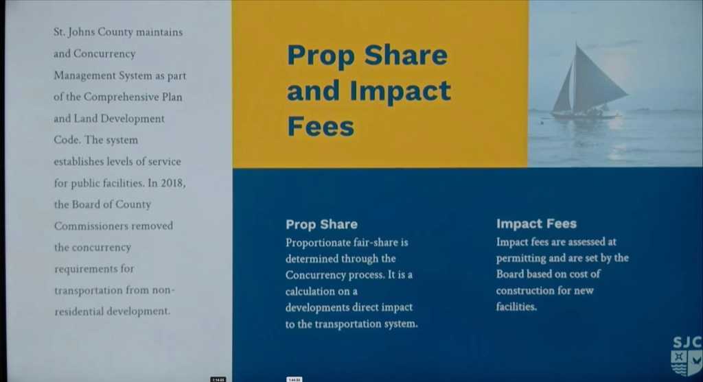 Residents may have seen a news report on First Coast News last week that included some erroneous statements about this Agenda item. Commissioner Whitehurst asked if anyone from the news station had reached out to anyone at the County to confirm details in the story and they had not. Commissioner Whitehurst then asked a clarifying question about the statement in the article that commercial development is not paying any impact fees. Mr. D’Souza confirmed that is an incorrect statement, “everybody pays impact fees.” Commercial development is being assessed impact fees and paying impact fees.