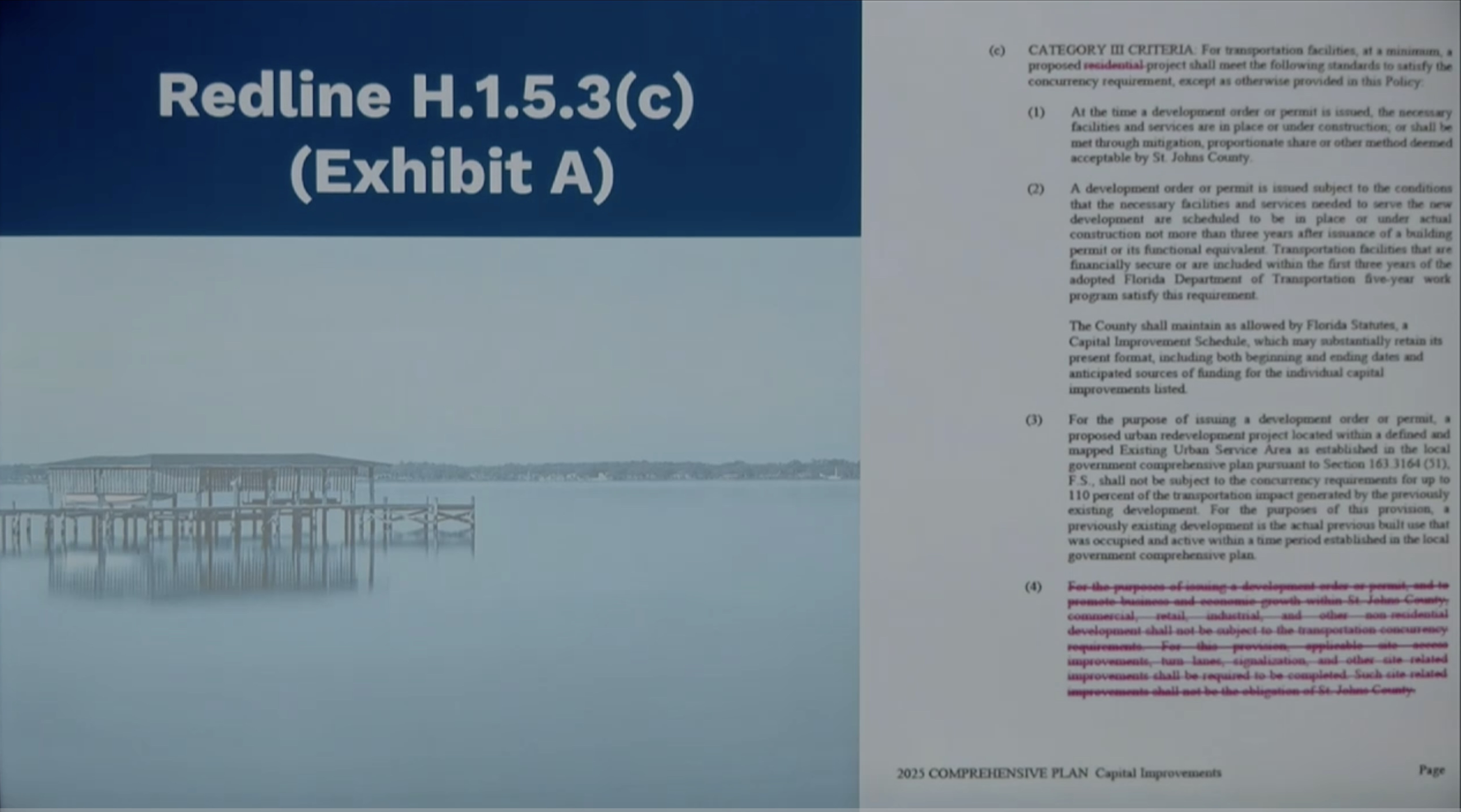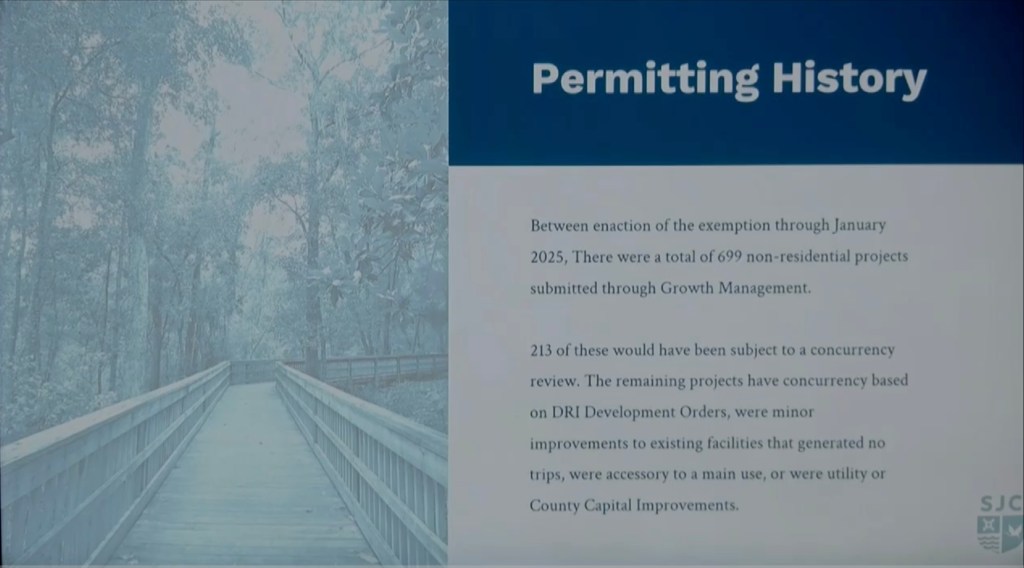 Agenda Item 2 – Non Residential Concurrency – “At the December 17, 2024 meeting, the Board directed staff to bring back an agenda item to consider the removal of the non-residential transportation concurrency exemption. Staff are returning with an ordinance and supplemental information for discussion and direction. This item will come back to the Board for a vote on adoption no sooner than February 18, 2025.”