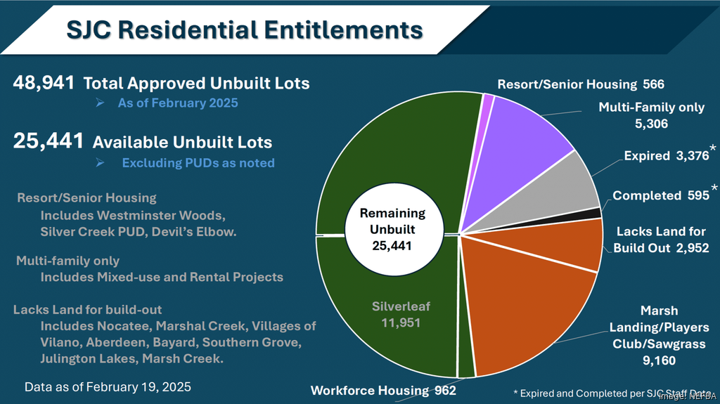 Agenda Item 2 is a discussion on Residential Entitlements Data. What is that? We often hear that there in the neighborhood of 60,000 homes that are entitled to be built but have not been built, therefore no new homes need to be approved until the Infrastructure catches up. The Northeast Florida Builders Association (NEFBA) has long said that the number is not correct. This discussion item is to explore the differences in what NEFBA believes is remaining to be built and what the County database shows is remaining to be built.