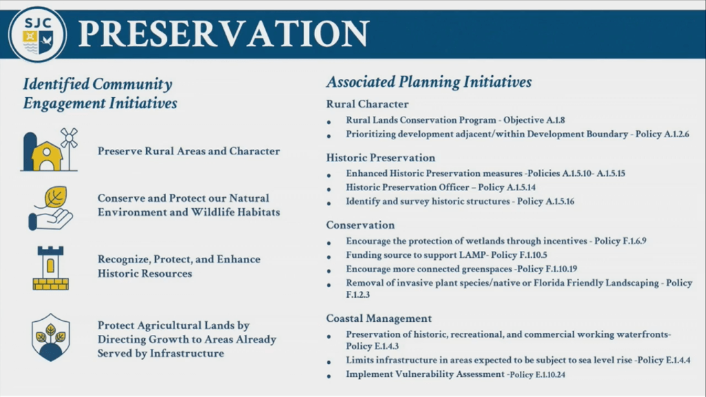 “This is the adoption hearing for a Comprehensive Plan Amendment to amend Goals, Objectives, and Policies of the St. Johns County 2025 Comprehensive Plan in order to comply with Section 163.3177, Florida Statutes, with the issuance of the 2023 North Florida Regional Water Supply Plan. The statute requires local governments to amend their Comprehensive Plans to include selected projects from the updated regional water supply plan and to update its Water Supply Facilities Work Plan, adopted by reference in the Comprehensive Plan. The amendment was brought before the PZA on March 6, 2025, for a motion to recommend transmittal to state agencies for review. There were minor comments and questions from Agency members along with one public comment on aquifer withdrawal. The Agency subsequently voted unanimously to approve the motion. On April 1, 2025, the amendment was brought in front of the BCC for a motion to transmit to state agencies for review. Staff answered questions from the Chair on alternative water supply projects that the County has selected. In addition, a public comment was discussed on gray water availability for reuse. The BCC subsequently unanimously approved the motion to transmit. The amendment was sent out for state agency review on April 4, 2025. No substantial comments or concerns with the amendment were received from the state agencies by the 30-day deadline. Staff intends to bring the amendment to the PZA again on May 15, 2025, for a recommendation to adopt and will verbally advise the Board of any issues or questions asked.”
