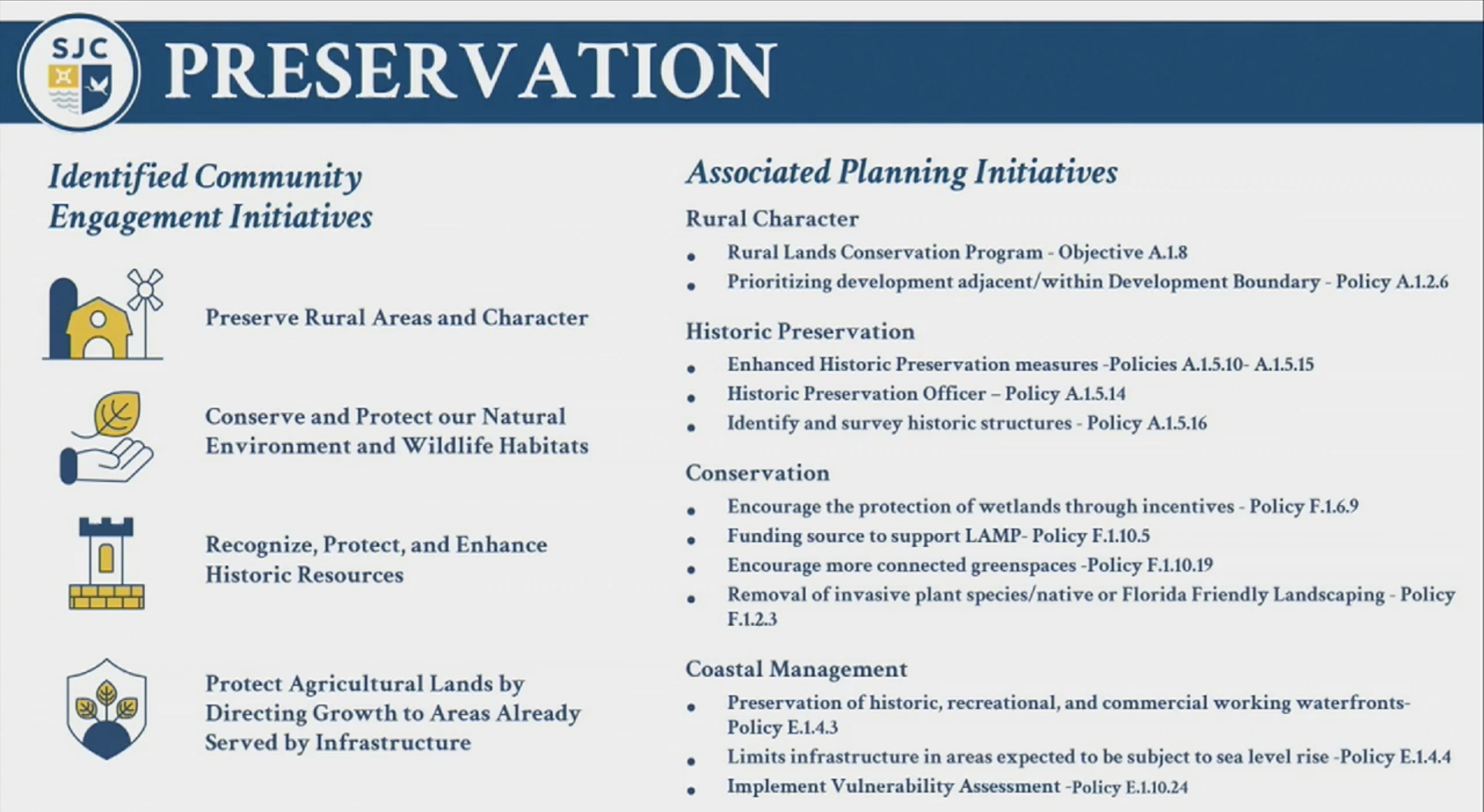 “This is the adoption hearing for a Comprehensive Plan Amendment to amend Goals, Objectives, and Policies of the St. Johns County 2025 Comprehensive Plan in order to comply with Section 163.3177, Florida Statutes, with the issuance of the 2023 North Florida Regional Water Supply Plan. The statute requires local governments to amend their Comprehensive Plans to include selected projects from the updated regional water supply plan and to update its Water Supply Facilities Work Plan, adopted by reference in the Comprehensive Plan. The amendment was brought before the PZA on March 6, 2025, for a motion to recommend transmittal to state agencies for review. There were minor comments and questions from Agency members along with one public comment on aquifer withdrawal. The Agency subsequently voted unanimously to approve the motion. On April 1, 2025, the amendment was brought in front of the BCC for a motion to transmit to state agencies for review. Staff answered questions from the Chair on alternative water supply projects that the County has selected. In addition, a public comment was discussed on gray water availability for reuse. The BCC subsequently unanimously approved the motion to transmit. The amendment was sent out for state agency review on April 4, 2025. No substantial comments or concerns with the amendment were received from the state agencies by the 30-day deadline. Staff intends to bring the amendment to the PZA again on May 15, 2025, for a recommendation to adopt and will verbally advise the Board of any issues or questions asked.”