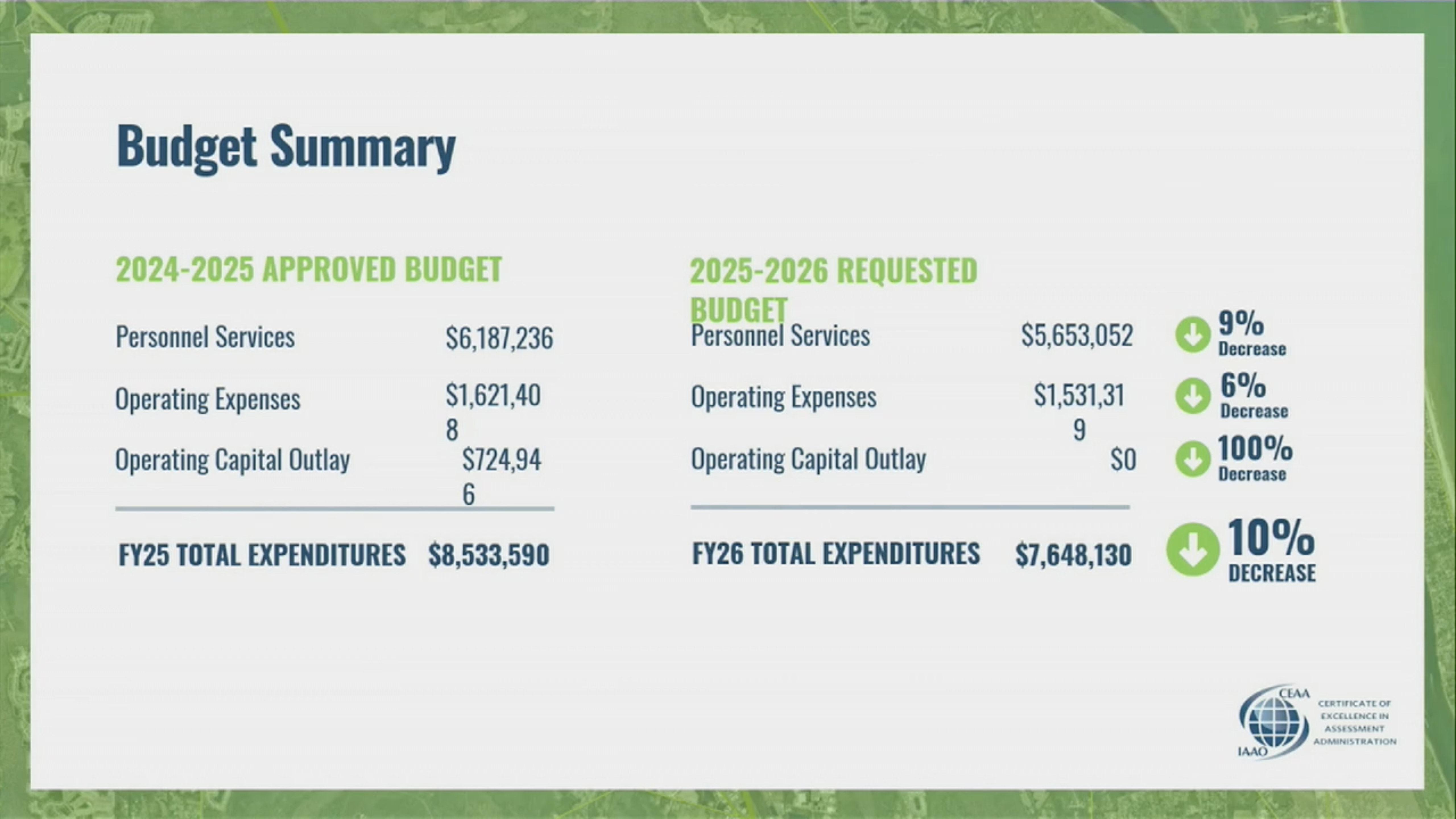 Tuesday’s presentation was from the Clerk of the Circuit Court and Comptroller and the Property Appraiser. It was pointed out that the budgets of the Tax Collector and the Property Appraiser are approved by the State Department of Revenue, not the local Commission, as their budgets are fee based. They are not required to submit their budgets to the county but the Property Appraiser has elected to do so. The Sheriff and Supervisor of Elections will be presenting their budgets at the June 17 Board meeting.