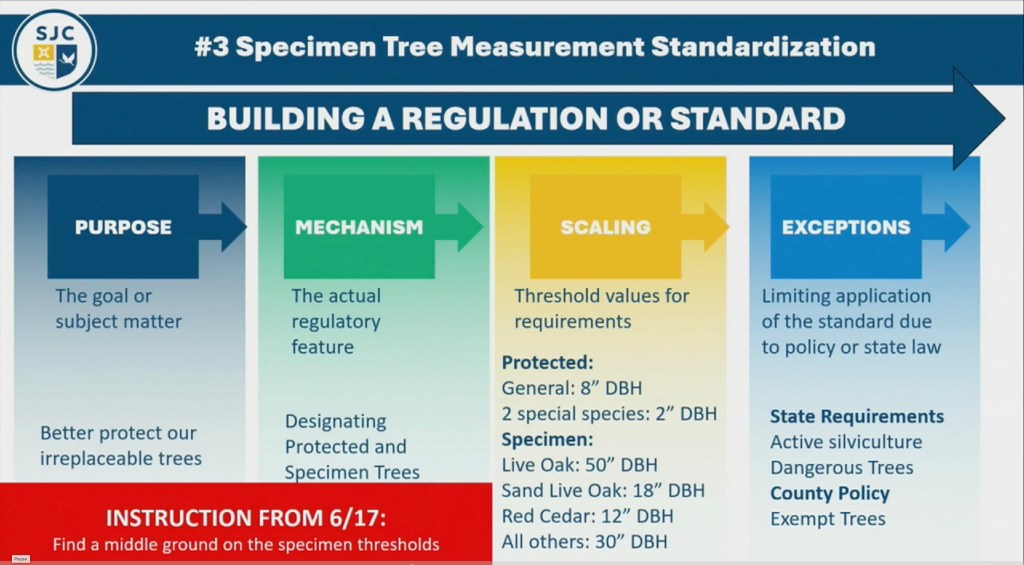 “First Hearing by the BCC on proposed Land Development Code, considering proposed “red-line” changes with regards to updates to the method of measuring and designating Specimen trees (LDC Article IV), increasing the per-inch Tree Deficiency Charge from $25.00 to $100.00 (LDC Article IV) and increase of the minimum preservation of upland natural vegetation required for certain Planned Urban Developments from 5% preserved to 10% preserved (LDC Article V). Also, a change to the definition of Specimen Tree is proposed in Article XII for consistency with the relevant change in Article IV.”