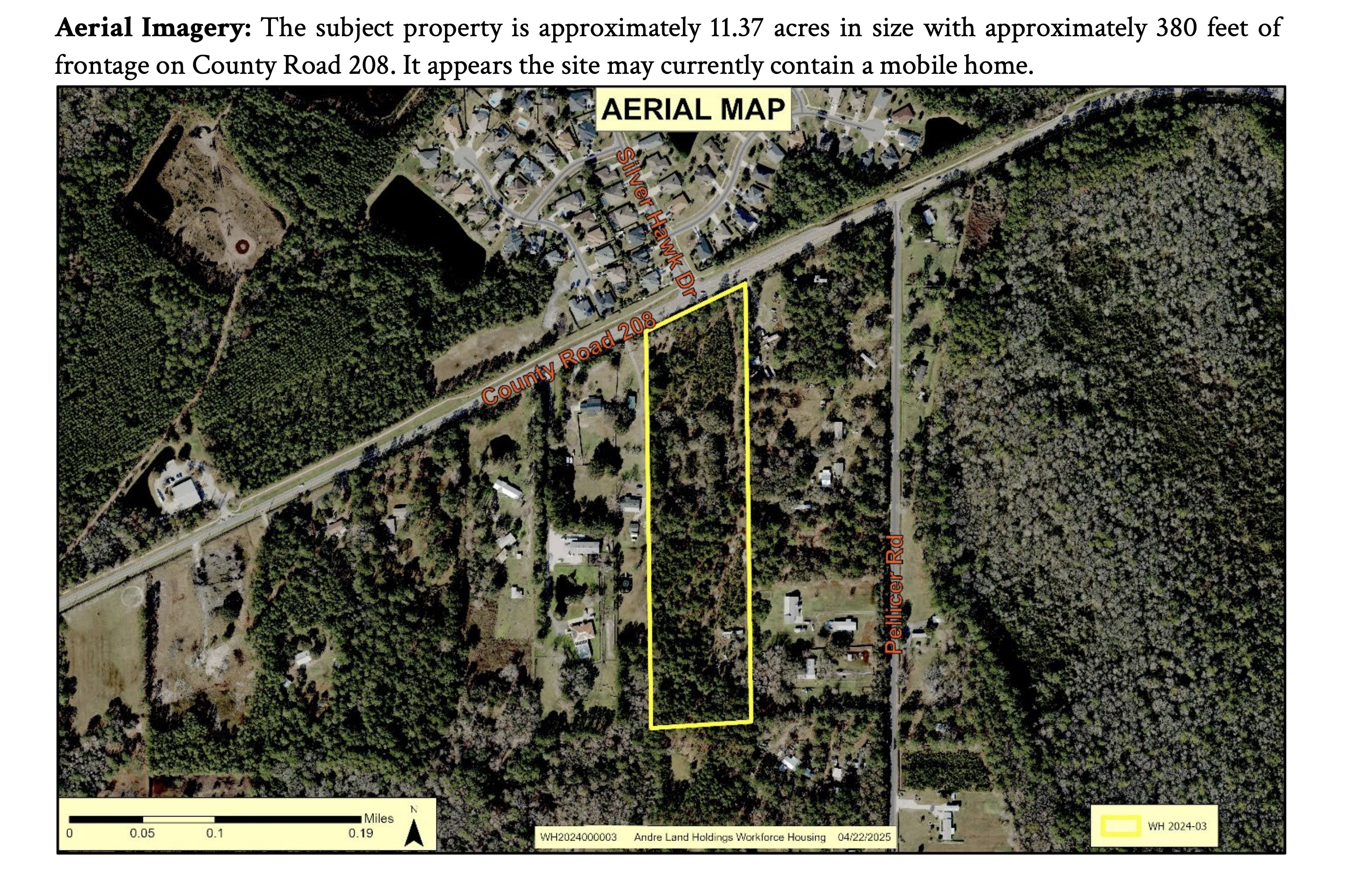 “Request to rezone approximately 11.37 acres of land from Open Rural (OR) to Workforce Housing (WH), located at 3165 County Road 208, Unit F. The Planning and Zoning Agency (PZA) heard this request at their regularly scheduled public hearing on June 5, 2025. The Agency recommended denial with a vote of 6-0, supported by members Perkins, Matovina, Hilsenbeck, Spiegel, Green, and Labanowski. Members discussed several issues, including specimen trees, pricing, number of units, housing types, area compatibility, and proposed density. Public comments addressed existing rural uses in the area such as livestock management, poultry, equine activities, fishing ponds, and recreational shooting. Discussions included potential impacts on area school overcrowding, as well as opinions that townhomes may not be suitable for the area, noting that there are currently too many unsold townhome units in the County. More information is provided in the Staff Report.