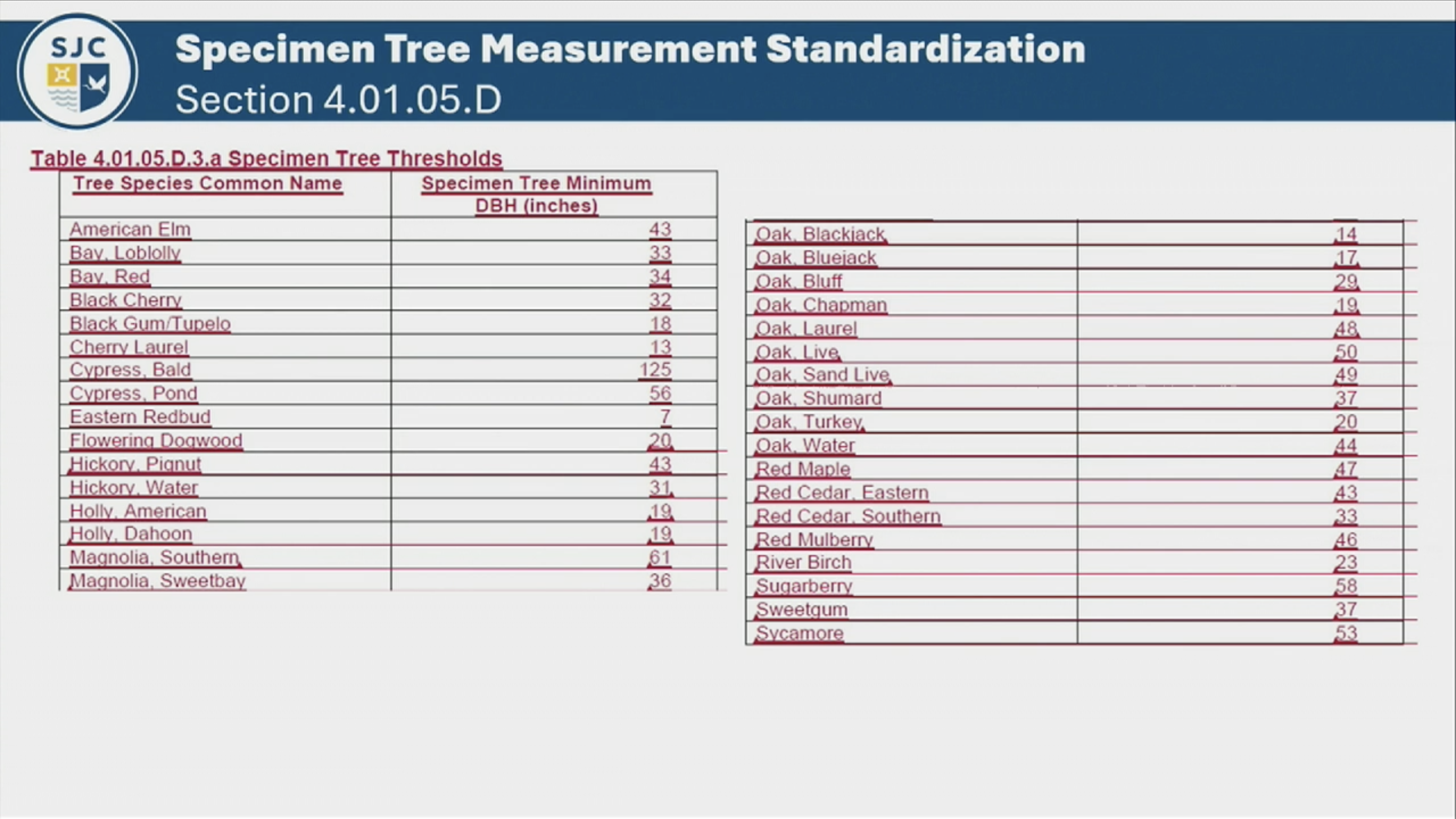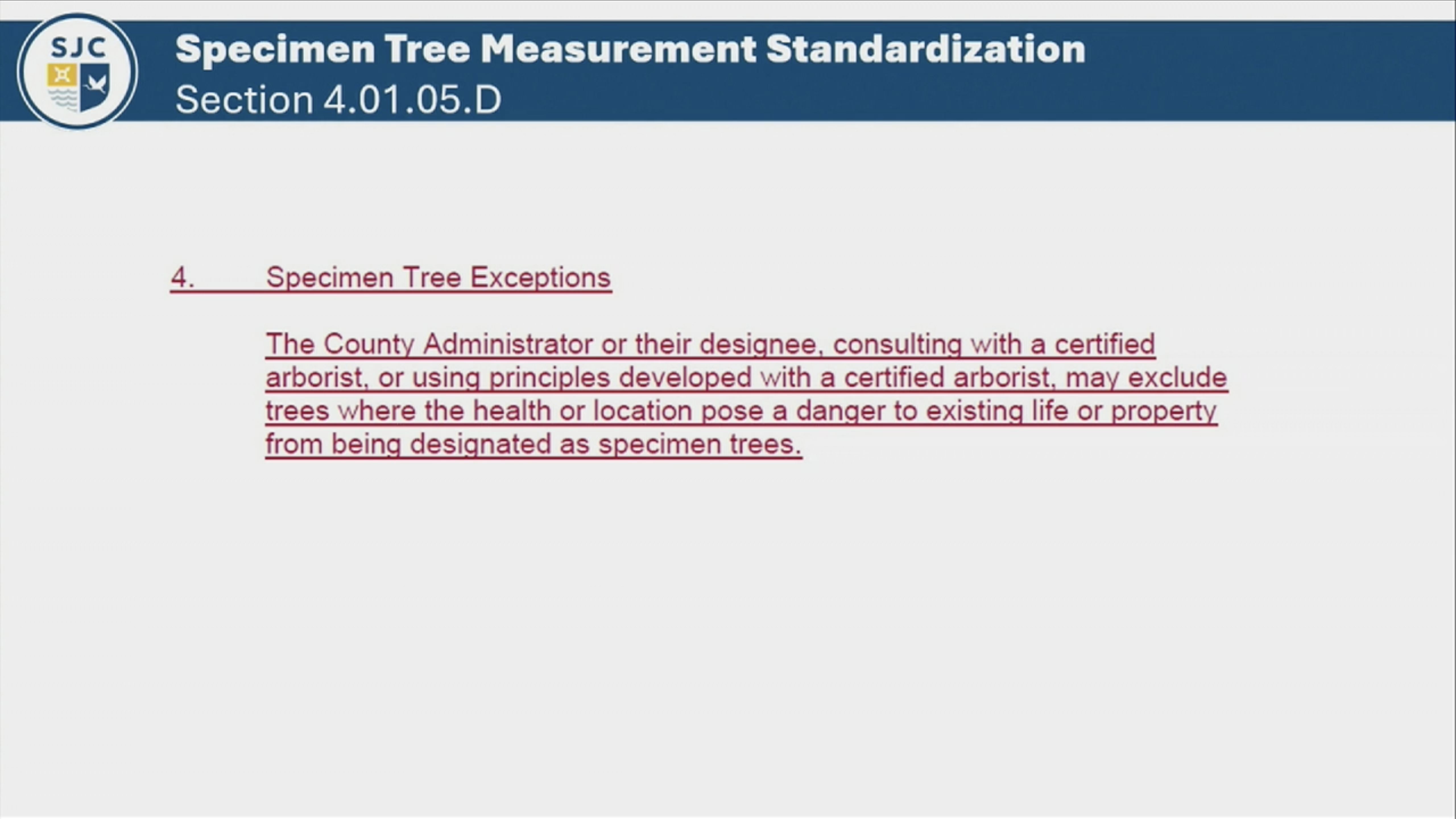 “First Hearing by the BCC on proposed Land Development Code, considering proposed “red-line” changes with regards to updates to the method of measuring and designating Specimen trees (LDC Article IV), increasing the per-inch Tree Deficiency Charge from $25.00 to $100.00 (LDC Article IV) and increase of the minimum preservation of upland natural vegetation required for certain Planned Urban Developments from 5% preserved to 10% preserved (LDC Article V). Also, a change to the definition of Specimen Tree is proposed in Article XII for consistency with the relevant change in Article IV.”