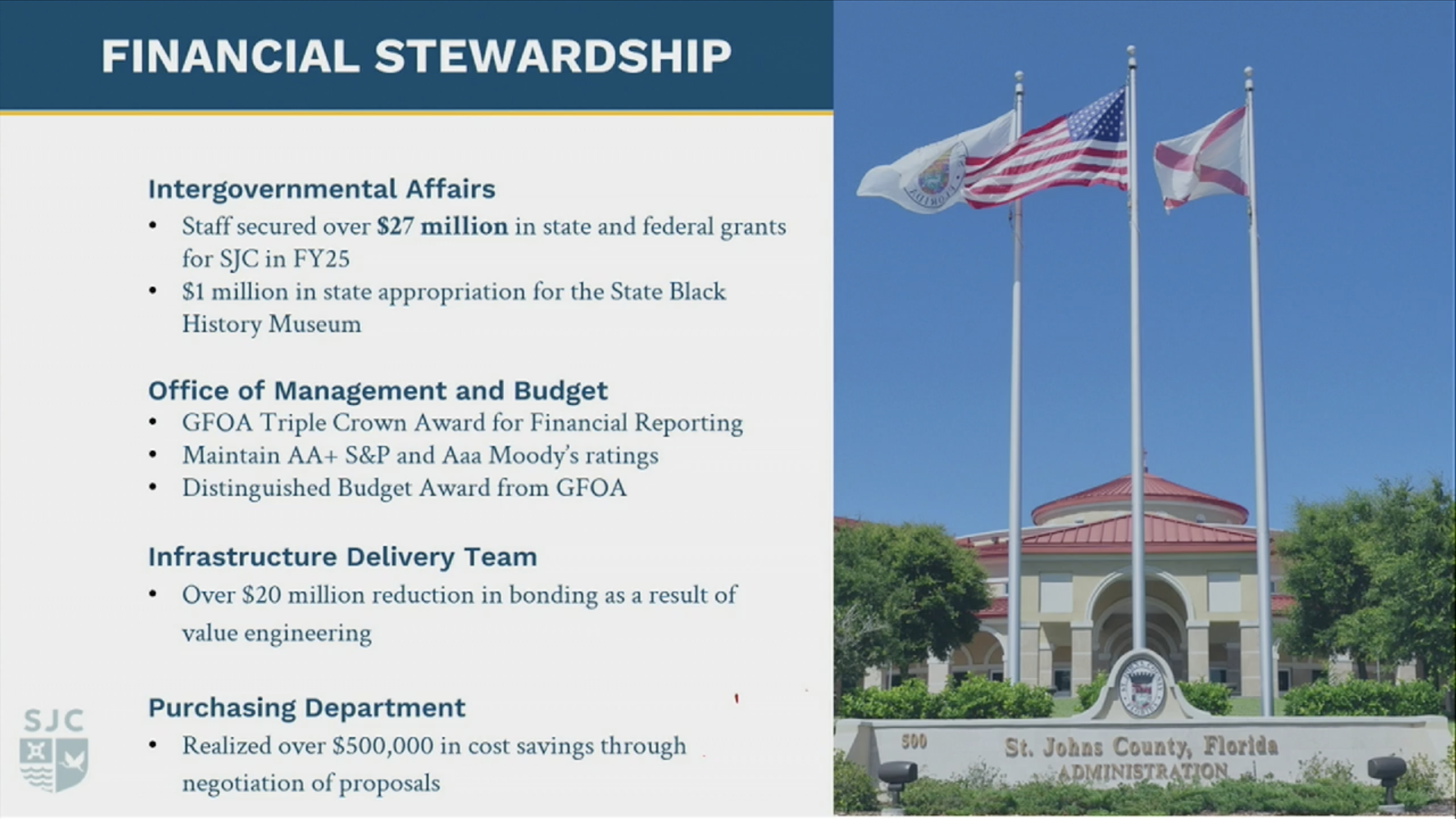 The first set of slides is from the County Administrator’s Recap of key accomplishments related to the County’s budget for the past year.