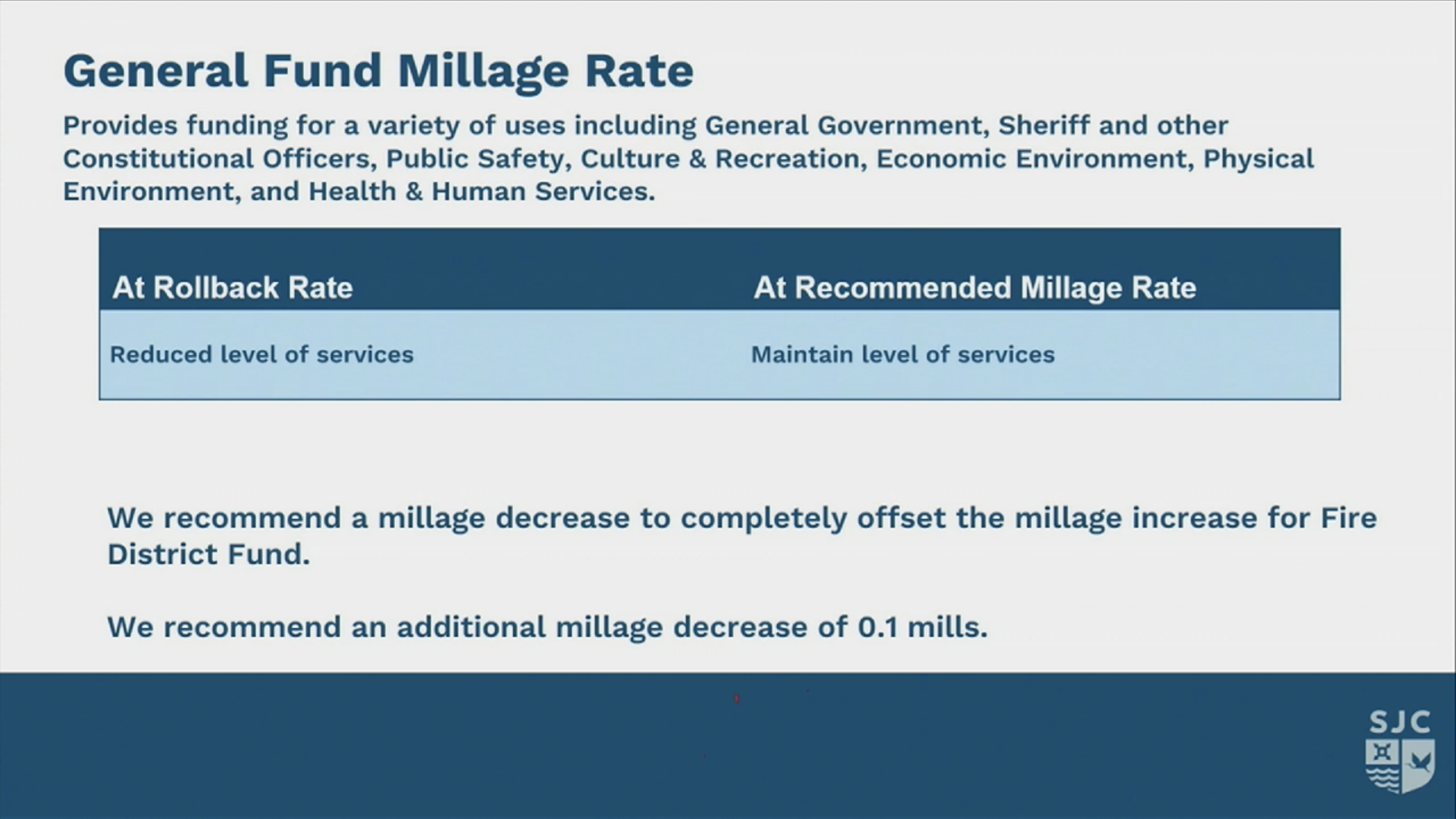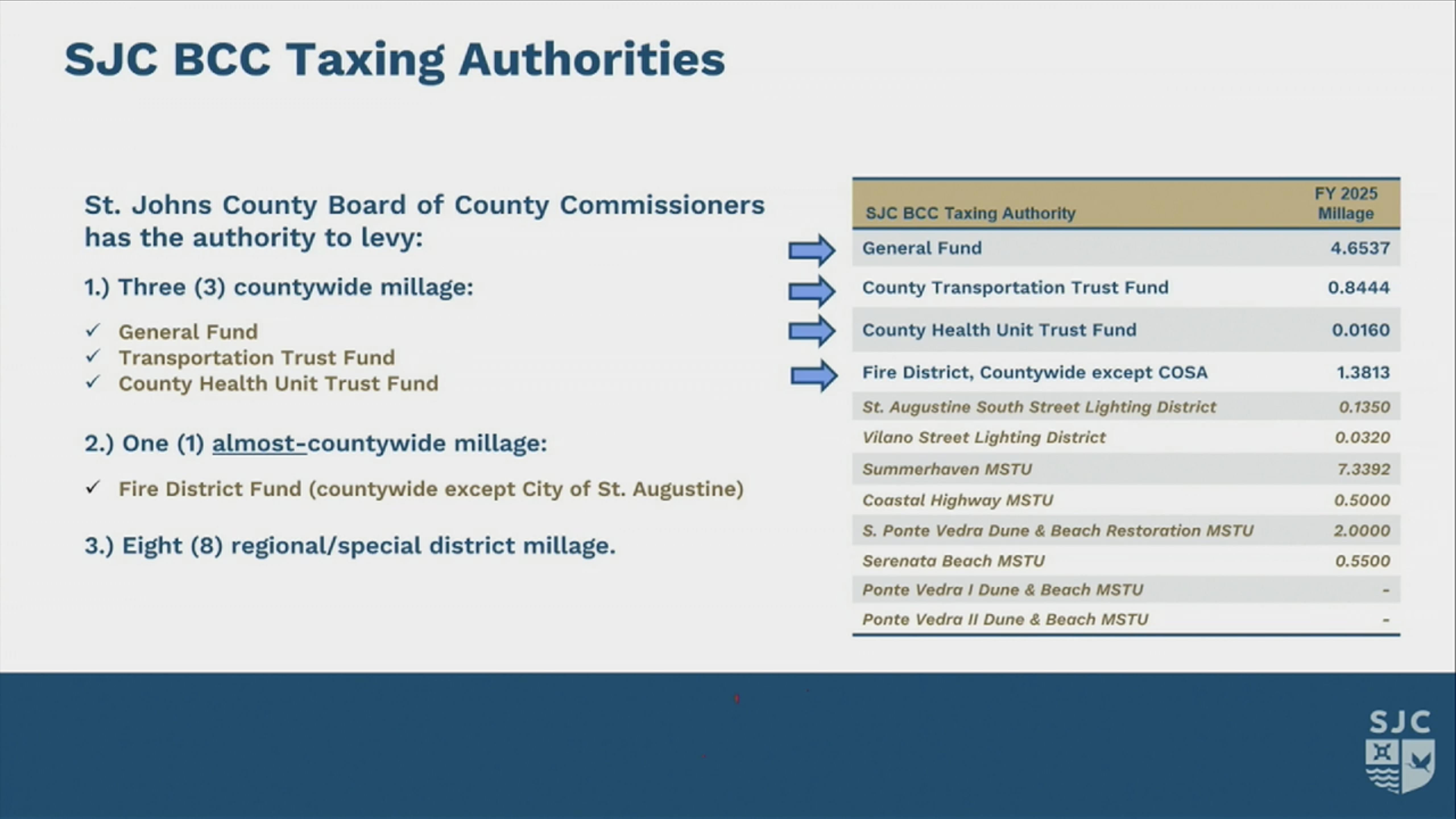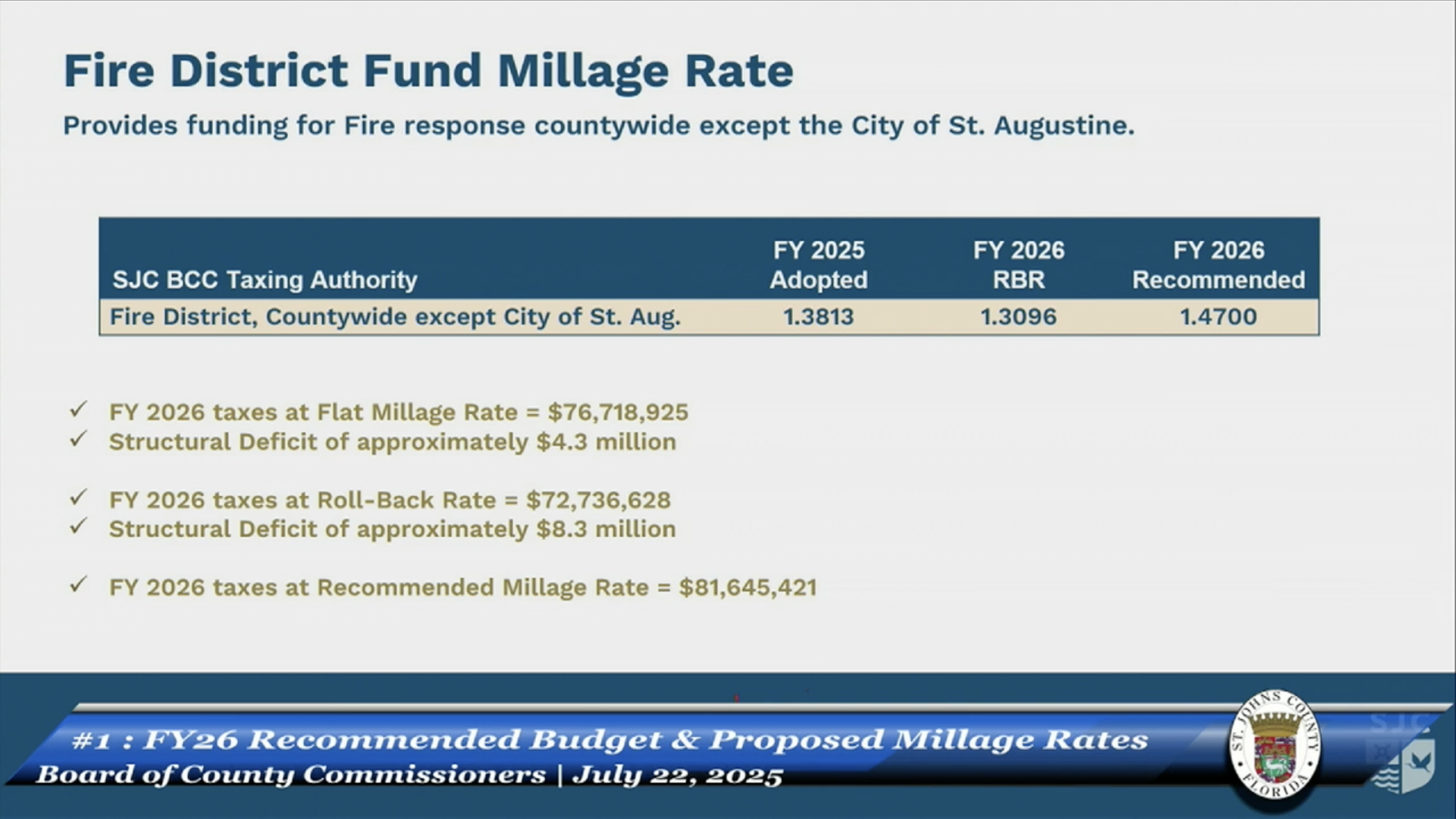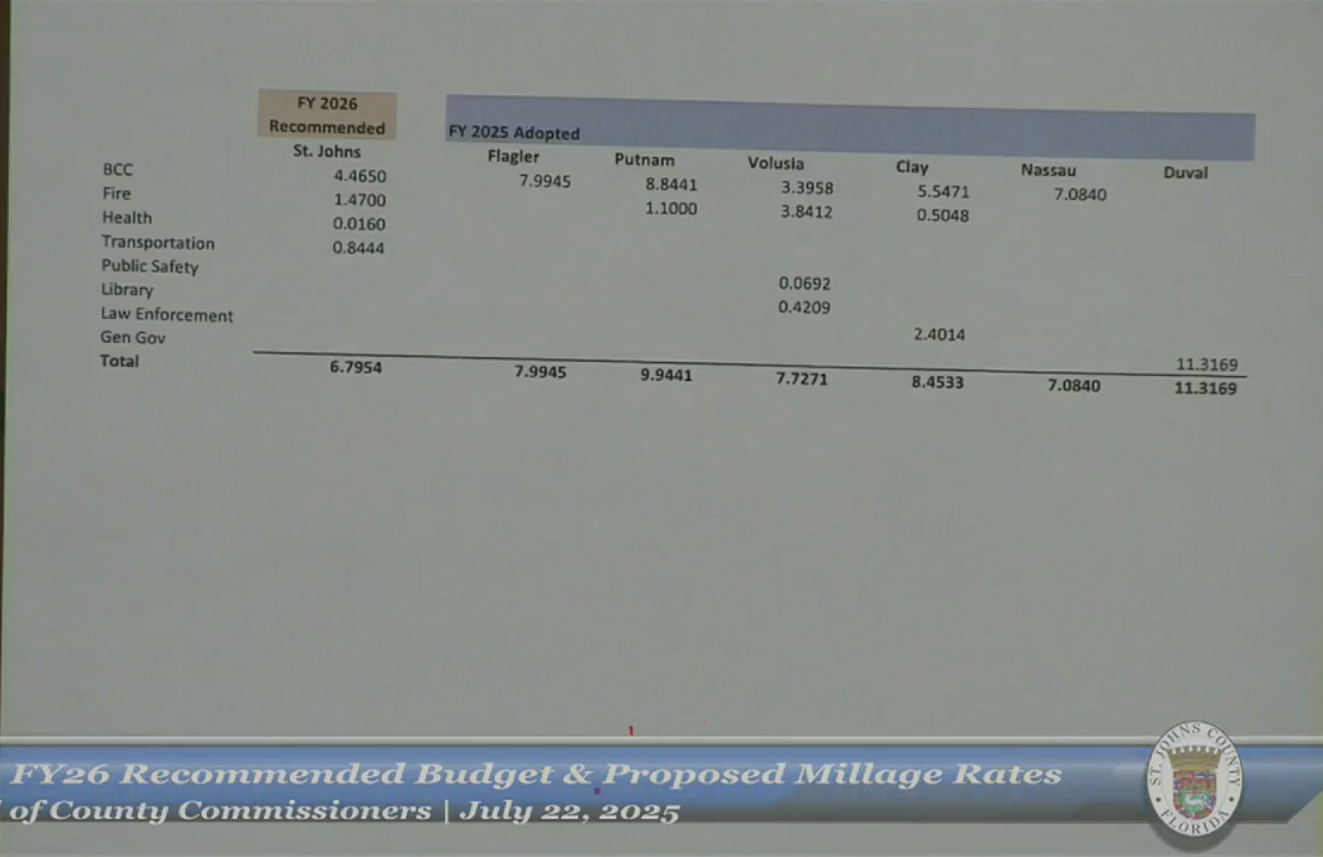 This slide was a requested comparison of St Johns County millage rates compared to surrounding counties.
