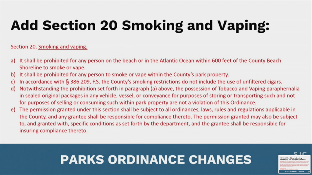Agenda item 3 – Second Reading of Ordinance amending the St. Johns County Park Ordinance, adding definitions; adding prohibition of smoking and vaping in St. Johns County beaches and parks; amending to include cigarette butts and vaping paraphernalia as defined litter.