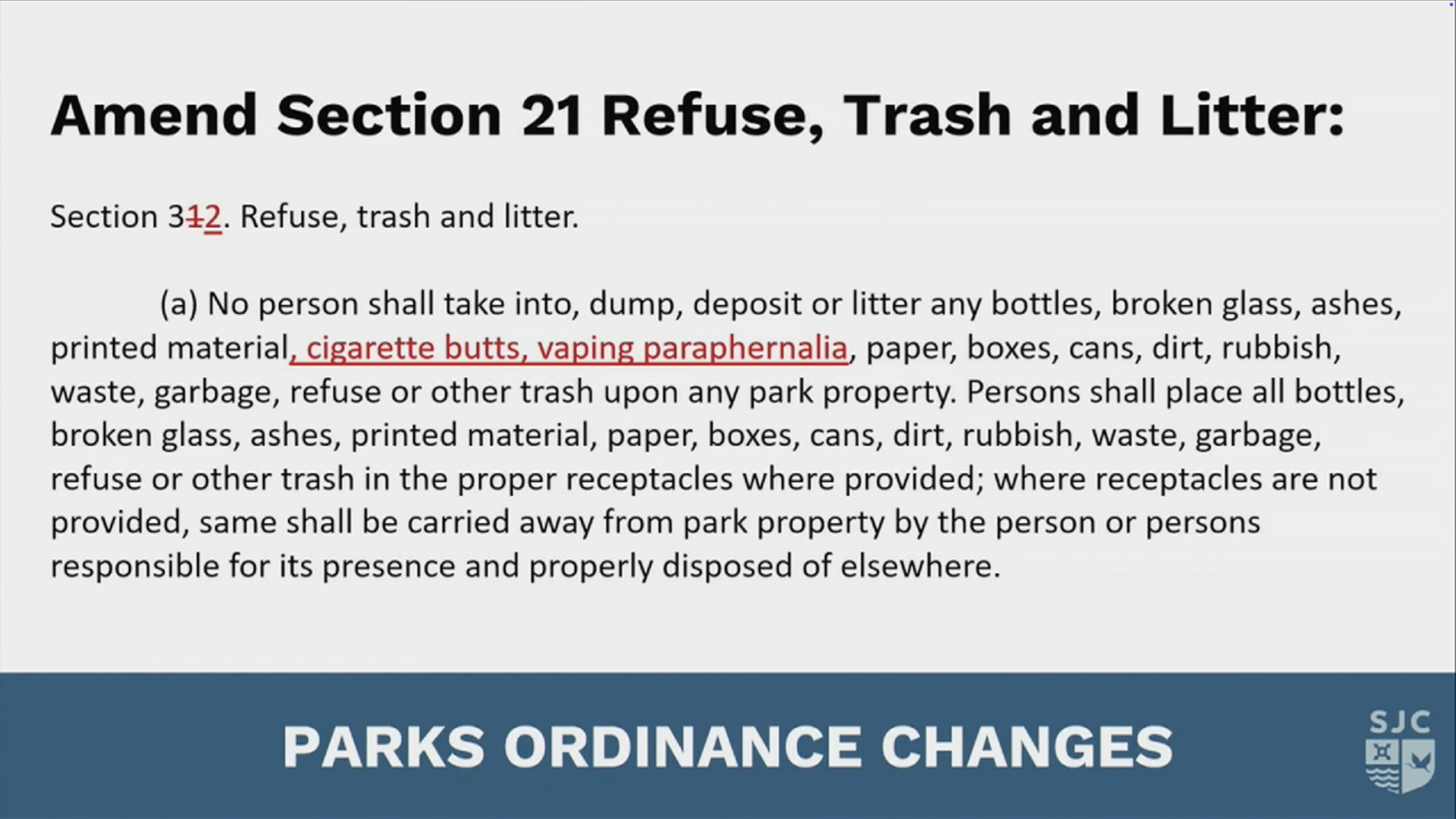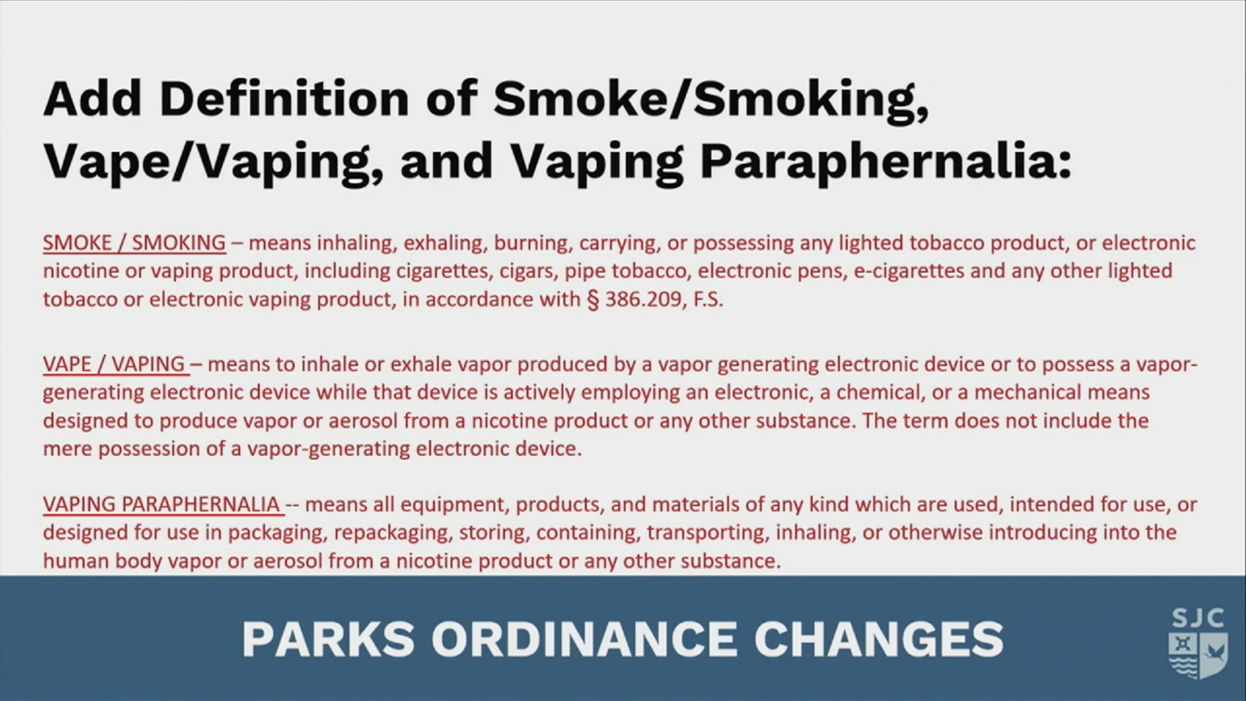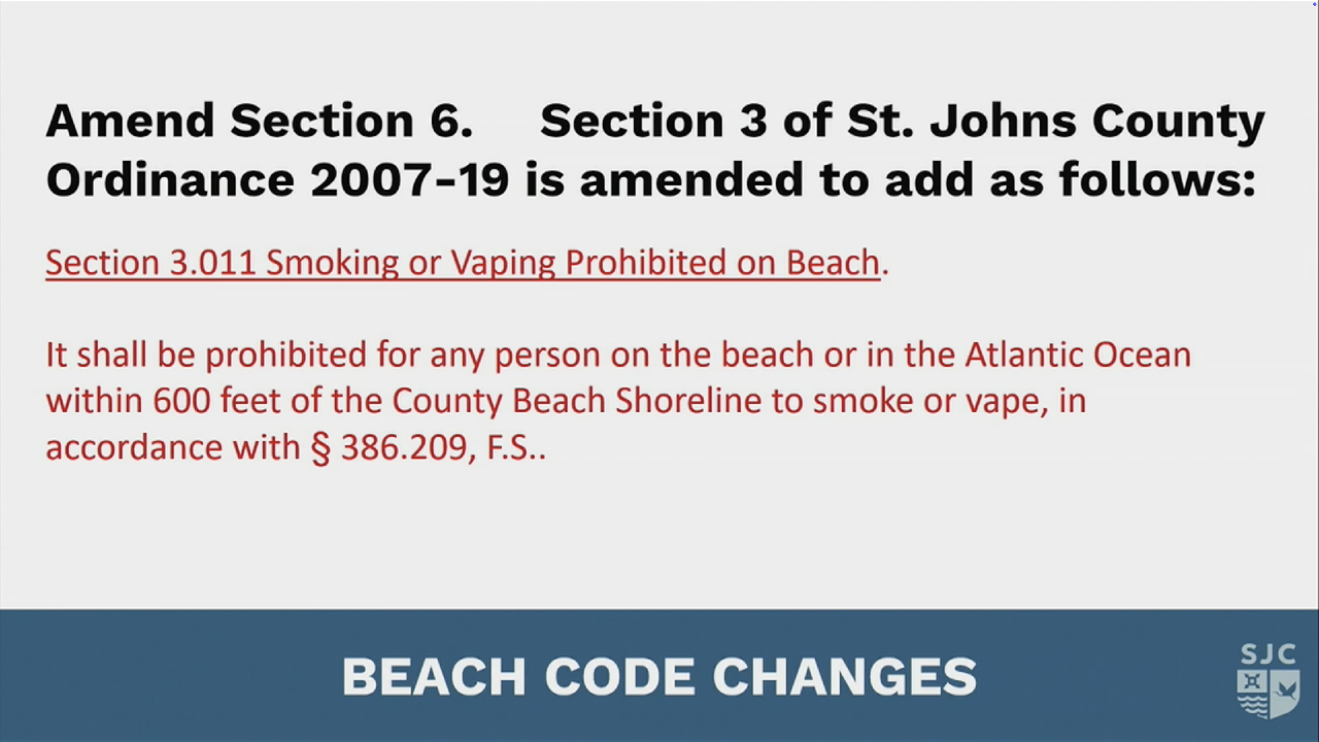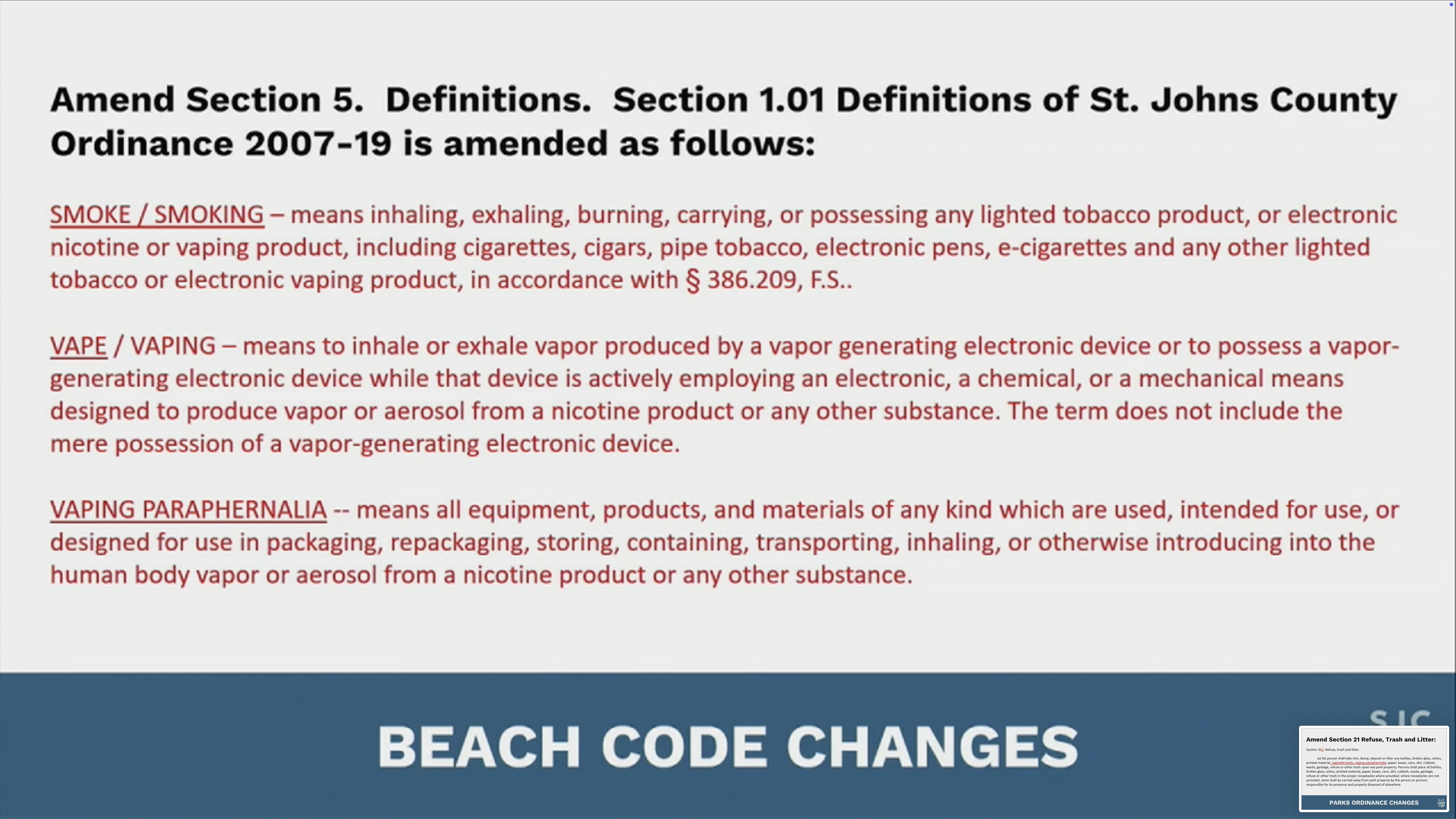 Agenda item 3 – Second Reading of Ordinance amending the St. Johns County Park Ordinance, adding definitions; adding prohibition of smoking and vaping in St. Johns County beaches and parks; amending to include cigarette butts and vaping paraphernalia as defined litter.